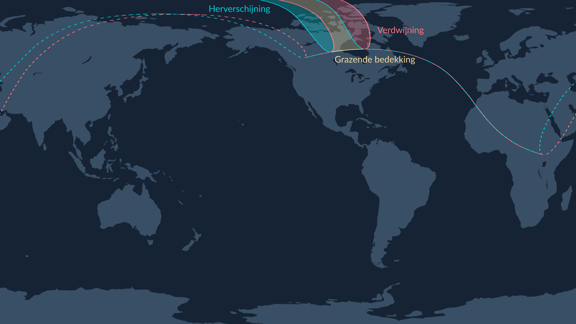 - Daarnaast vindt voor sommige regio’s een maansoccultatie van Venus plaats. Deze begint om 10:34 GMT en eindigt om 14:26 GMT, terwijl de Maan vanuit het perspectief van bepaalde delen van de wereld direct voor Venus langs schuift.