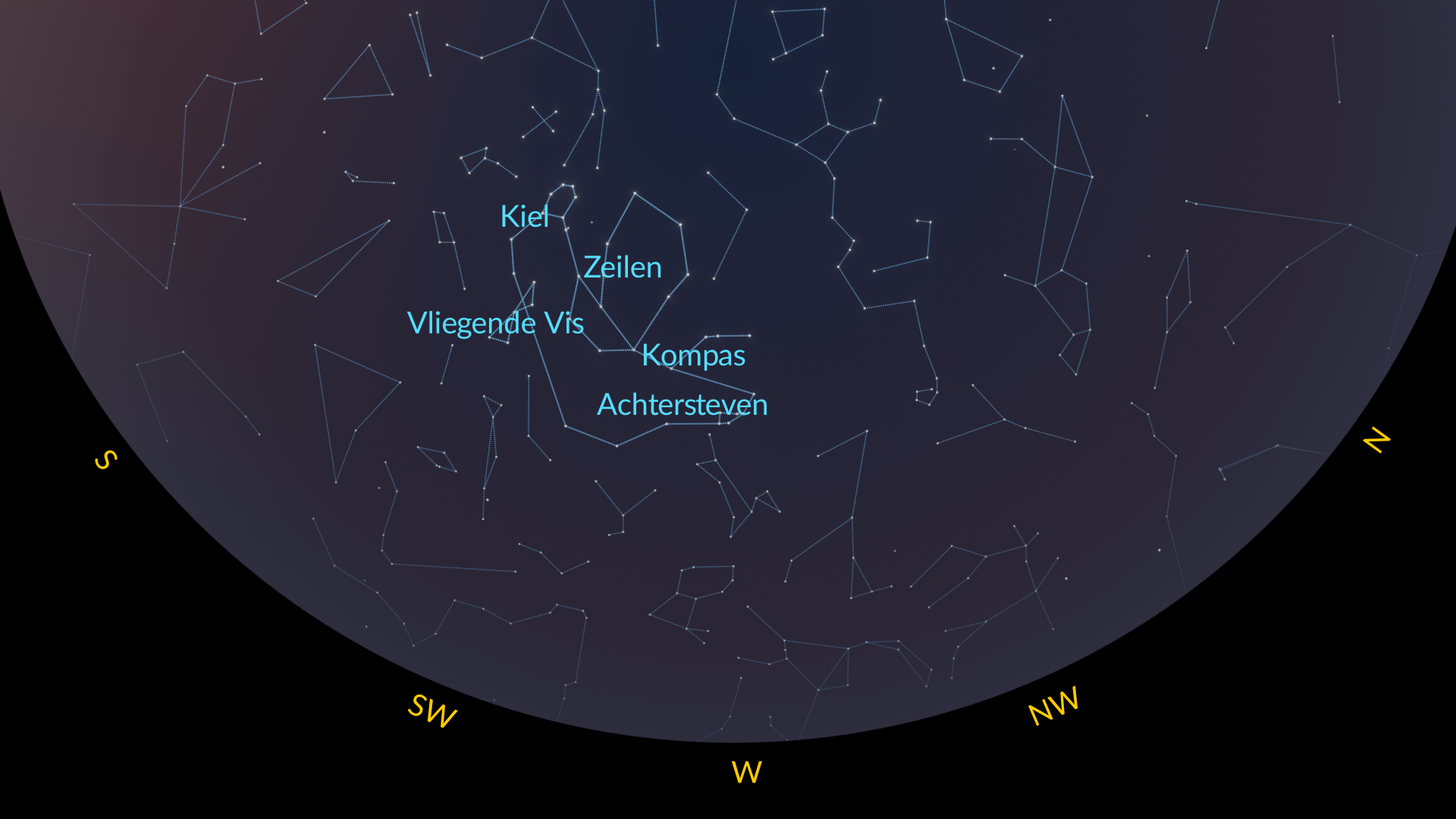 Op het zuidelijk halfrond biedt maart uitstekende zicht op Kiel, Achtersteven, Kompas, Zeilen en Vliegende Vis. Deze sterrenbeelden klimmen hoog aan de hemel en zijn het best te zien vanaf zuidelijke breedten. Waarnemers kunnen ook Kreeft en Kleine Hond dichter bij de noordelijke horizon vinden.