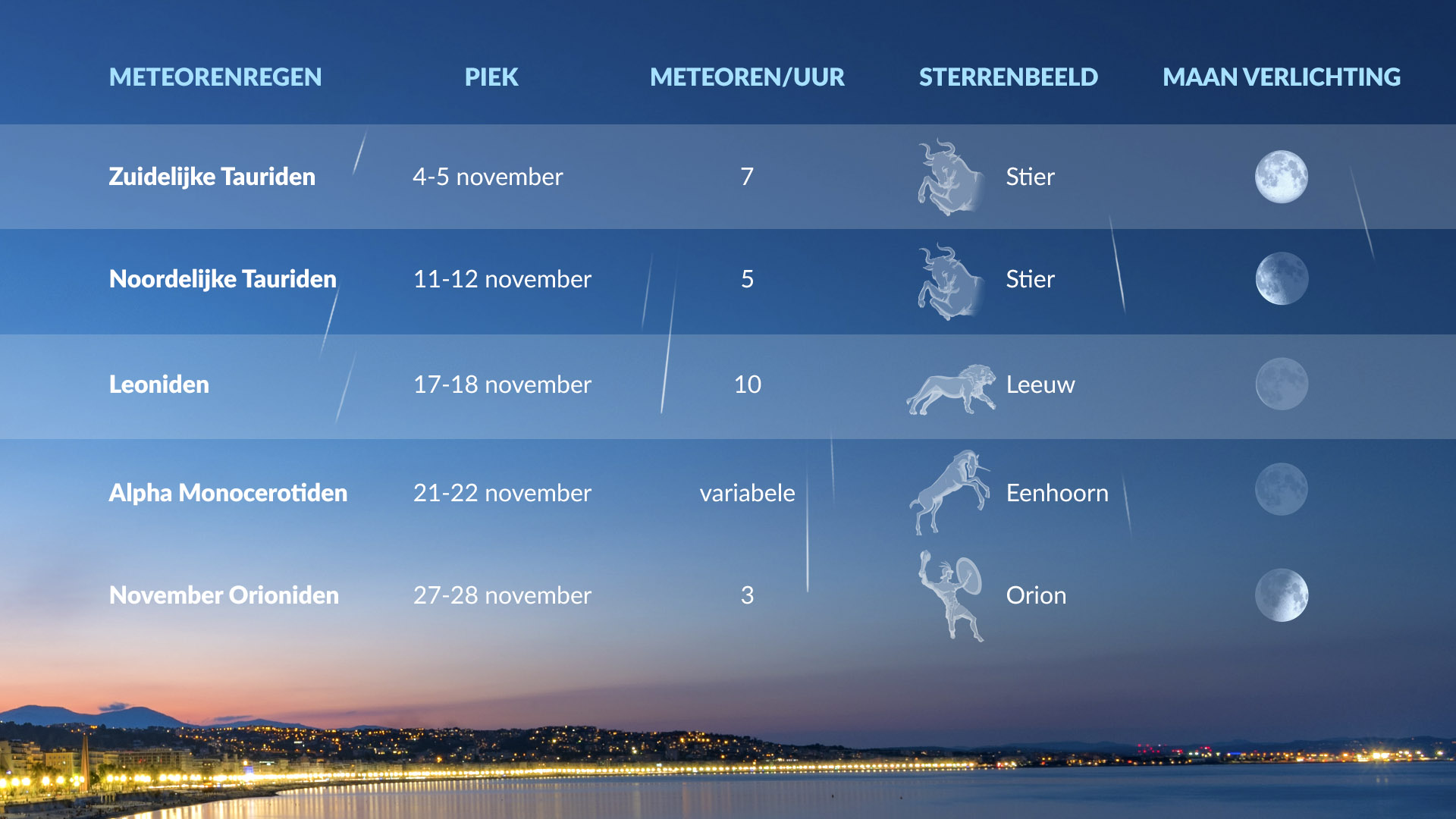 In totaal bereiken vijf meteorenregens deze maand hun piek. Het gaat om de Zuidelijke Tauriden, Noordelijke Tauriden, Leoniden, Alpha Monocerotiden en November-Orioniden, waarbij de meest productieve zwerm de Leoniden is.