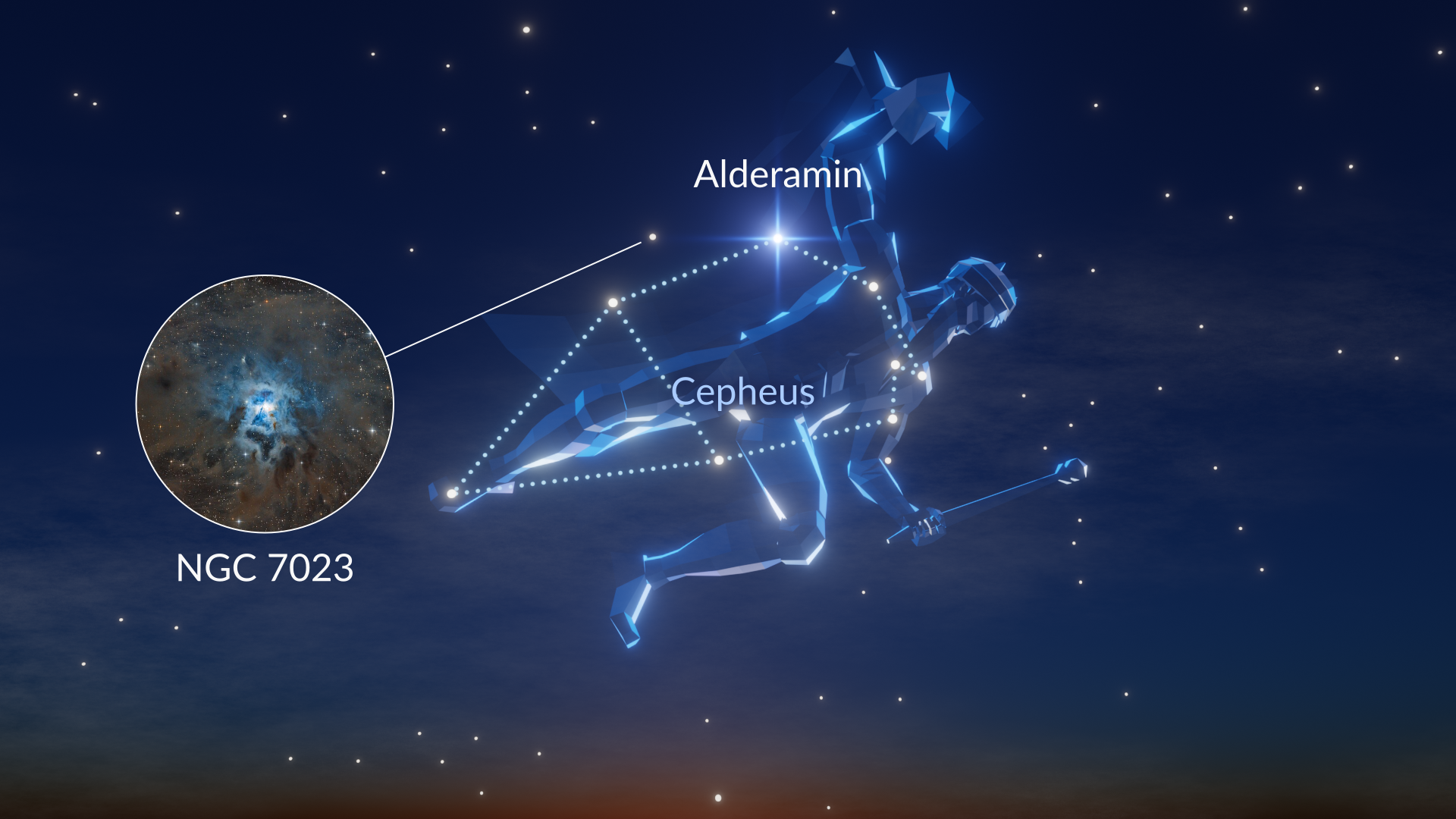 Cepheus bevindt zich tussen Cassiopeia en Polaris, dicht bij de noordelijke hemelpool. Het vijfhoekige patroon van sterren lijkt op een huisje uit een kindertekening.