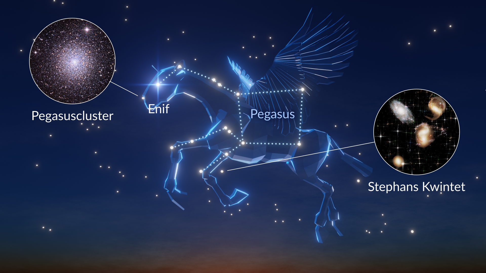 - Beste deep-sky-objecten: Grote Pegasuscluster (M15, mag 6,2), Stephan’s Quintet (stelselgroep, gecombineerde mag 13)