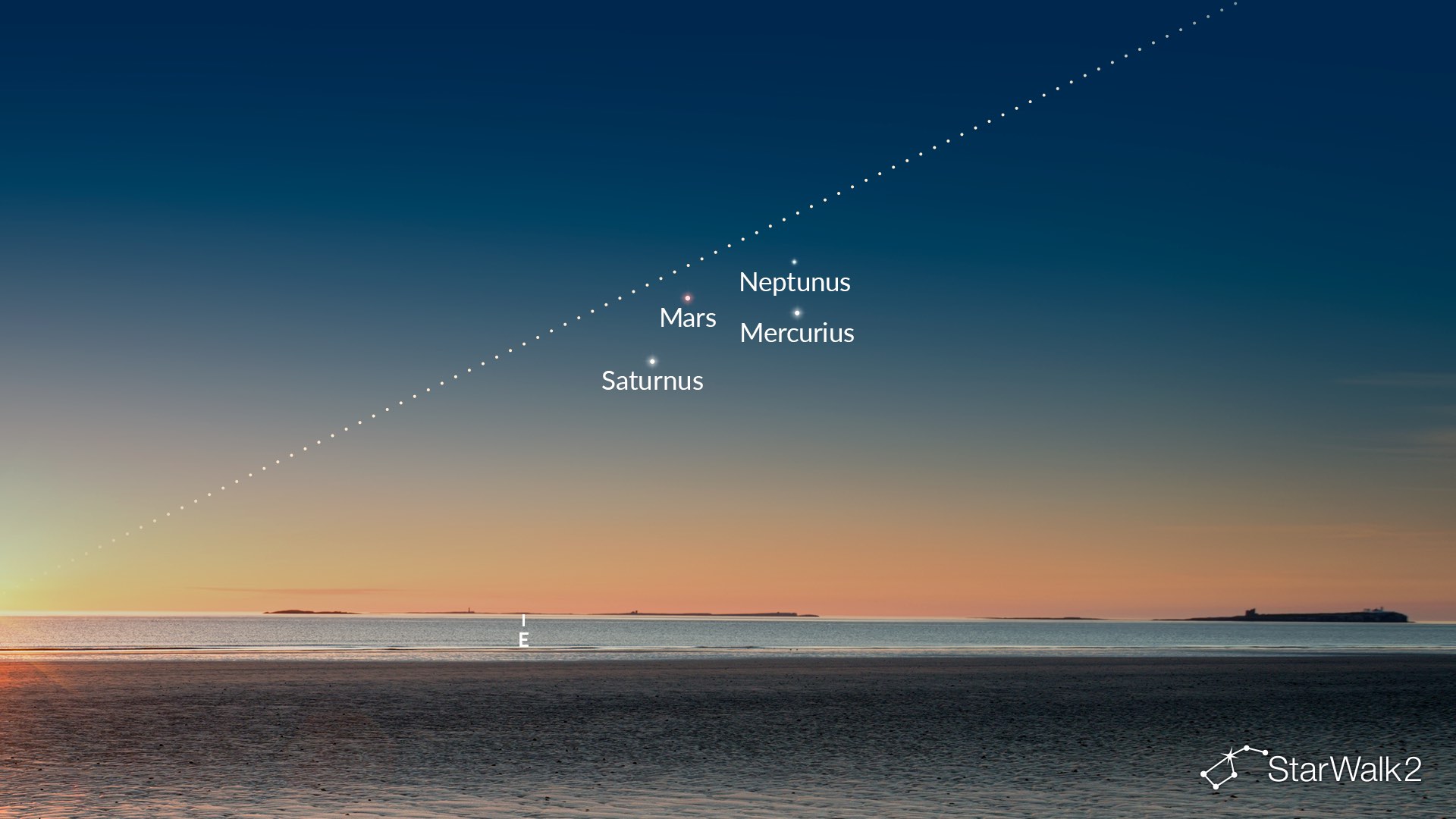 Voor de betrouwbaarste planning bekijk je de formatie in Star Walk 2 → Planet Walk voor jouw locatie: daar zie je wanneer elke planeet opkomt en hoe hoog die staat voordat de hemel te licht wordt.