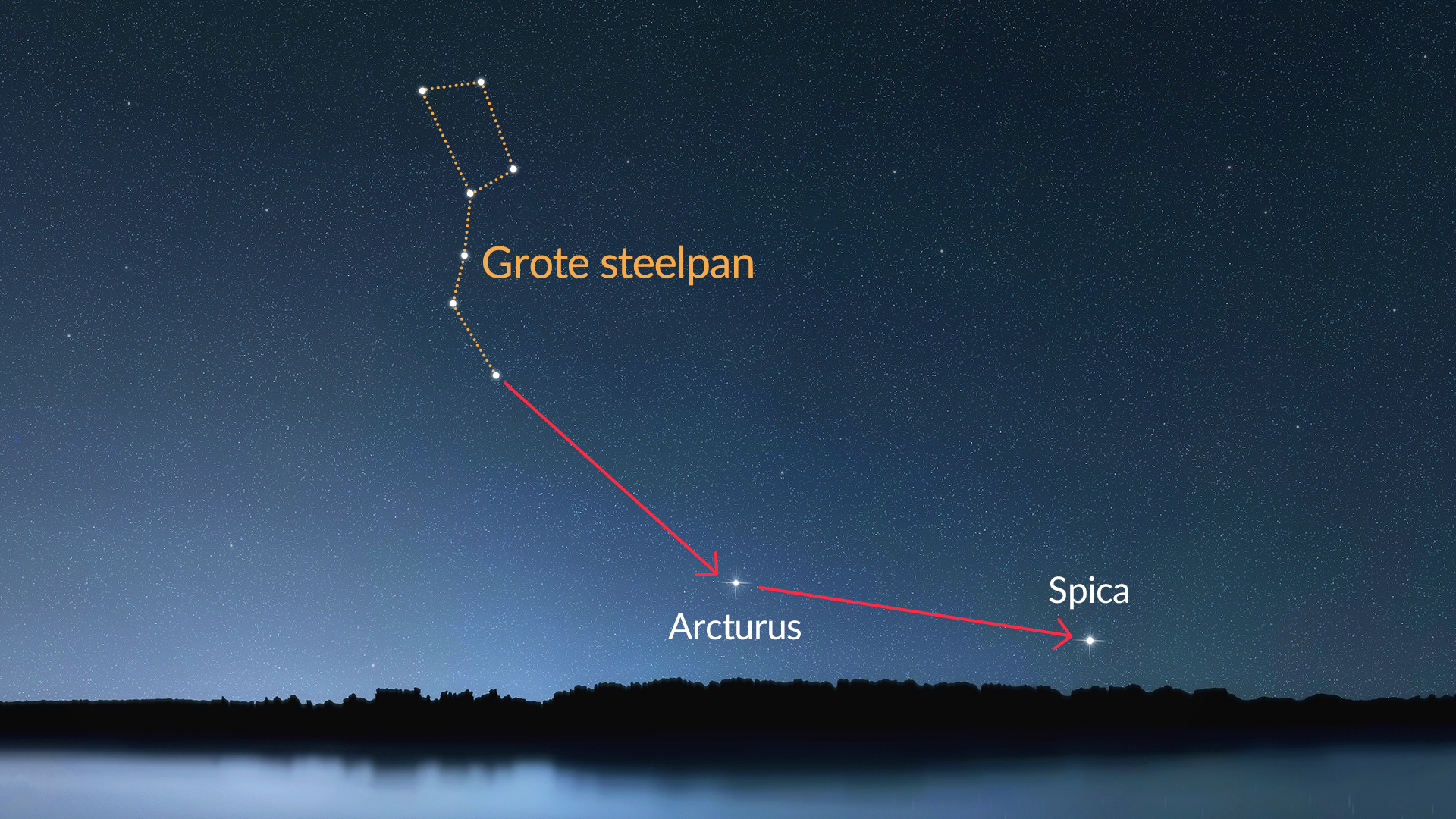 Een manier om Spica te lokaliseren is door gebruik te maken van de Grote Beer – een van de meest herkenbare sterpatronen aan de hemel. Verleng de bocht van de steel van de Grote Beer om Arcturus te vinden, en ga dan ongeveer even ver door om Spica te bereiken.