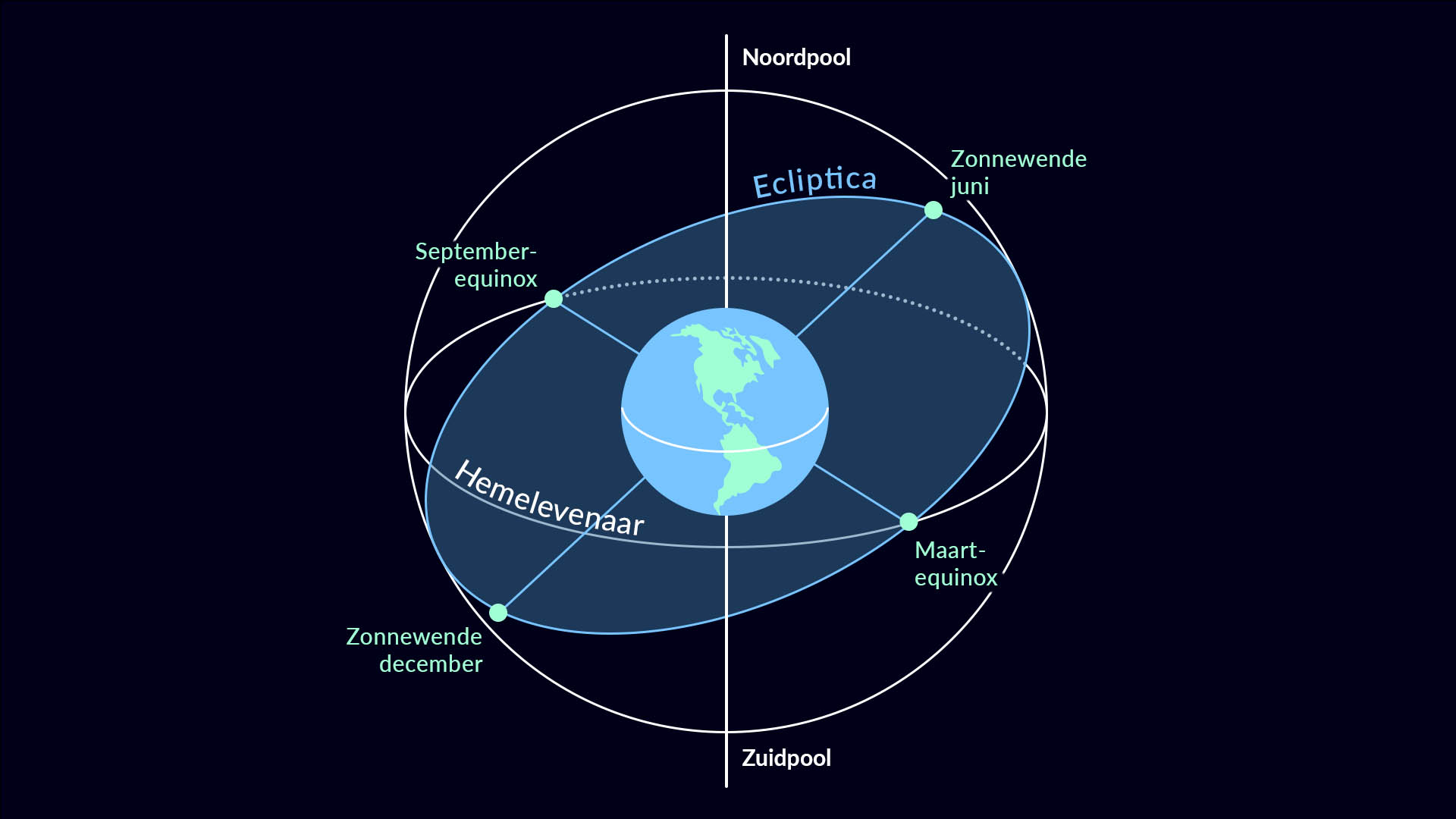 Op het moment van de equinox kruisen de ecliptica en de hemelevenaar elkaar (hier is een korte video om te laten zien hoe het werkt). De ecliptica is het pad van de Zon langs de hemel; de hemelevenaar is een denkbeeldige lijn die de evenaar van de Aarde doortrekt in de hemelbol. Ze staan onder een hoek van 23,4° ten opzichte van elkaar. Als die helling er niet was, zouden er geen seizoenen en zonnewendes zijn, en zouden we het hele jaar door equinox hebben.