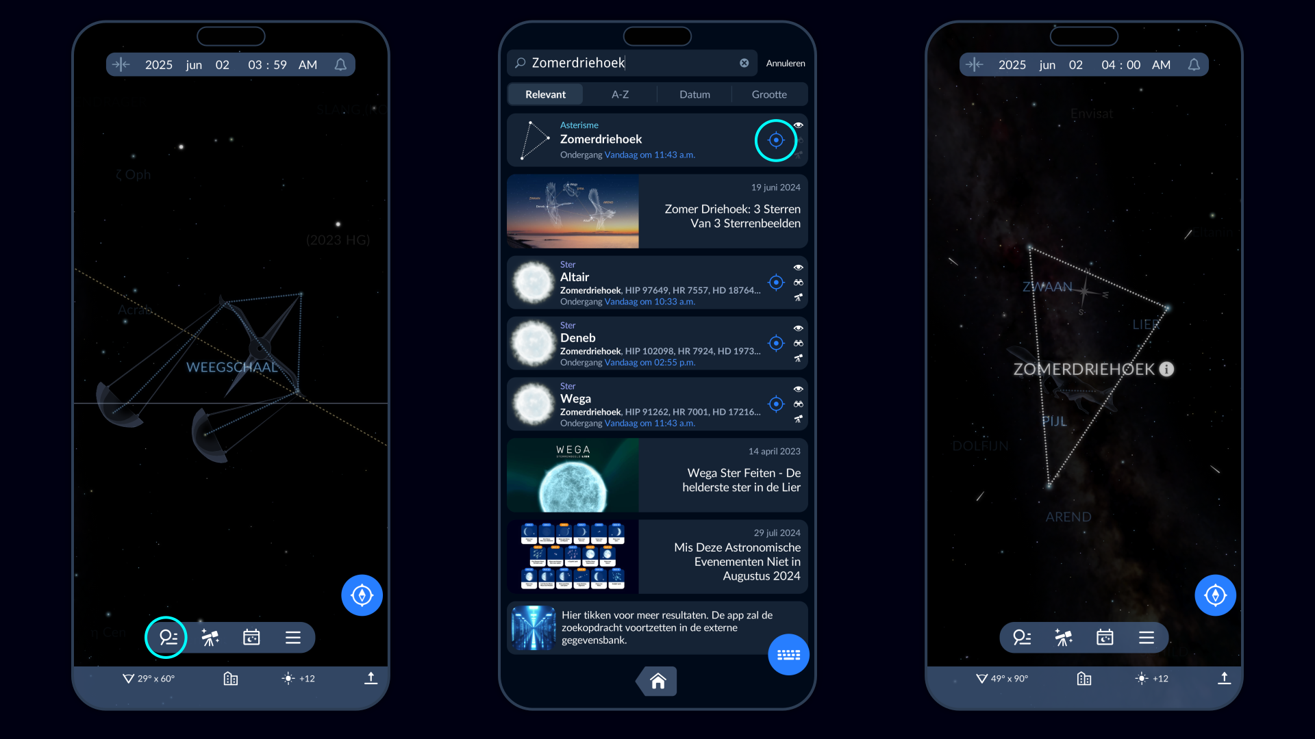 Dat is het! Verbind deze drie sterren en je hebt de Zomerdriehoek gevonden. Controleer je bevindingen met de Sky Tonight app: ga naar het zoekvenster, typ "Zomerdriehoek" in de zoekbalk en tik op het blauwe doelwit-icoontje zodra het resultaat verschijnt. De app toont je de locatie van de Zomerdriehoek aan de hemel. Richt je apparaat naar de hemel — de app laat een live sterrenkaart zien en volgt je bewegingen.