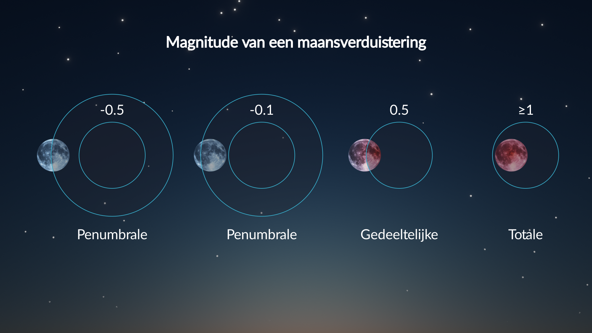De magnitude laat zien hoe diep de maan op het moment van maximum verduistering in de donkere centrale schaduw van de aarde (de umbra/kernschaduw) staat.