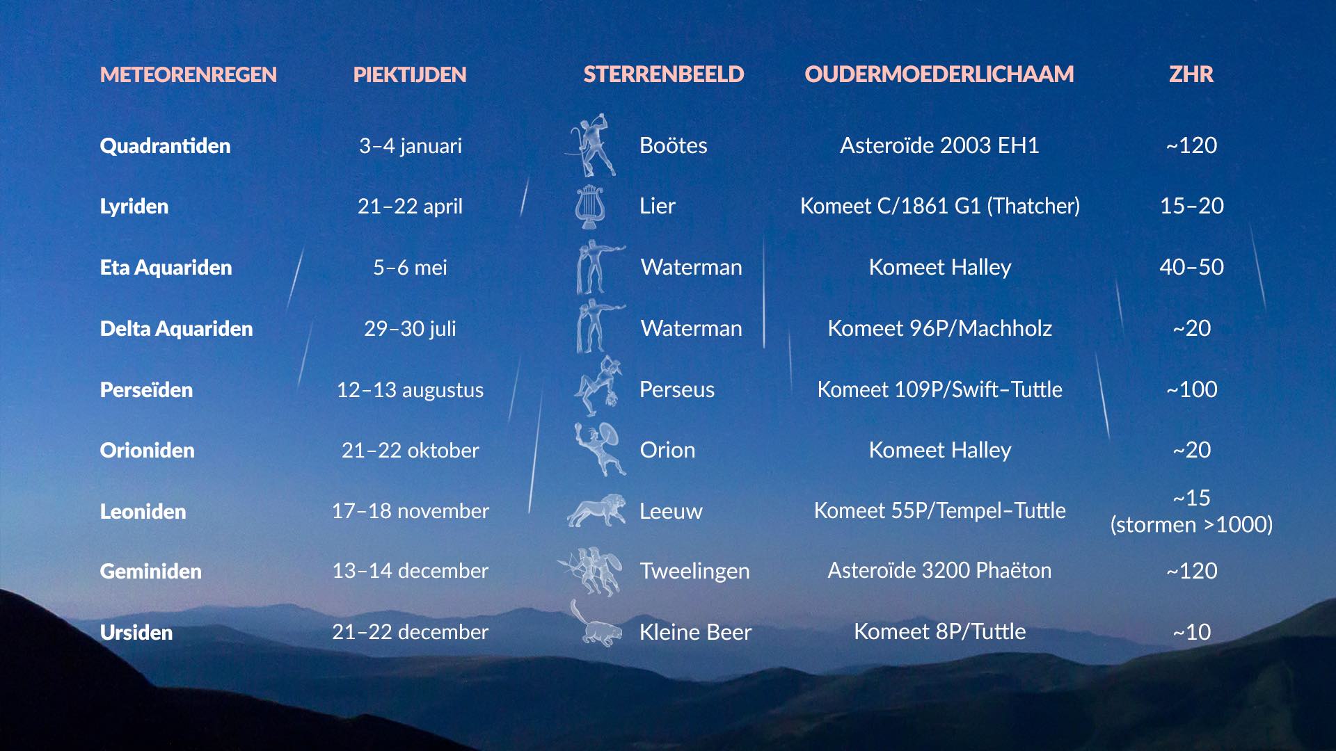 Elk jaar kruist de aarde verschillende bekende stromen van kometen- of asteroïdenpuin, wat betrouwbare meteorenregens oplevert. Hun activiteitsperiode, pieknachten en intensiteit verschillen, maar elke regen heeft een kenmerkend radiant (schijnbaar oorsprongspunt aan de hemel) en een bekend moedercelestisch lichaam. De ZHR (zenithale uurlijksnelheid) geeft het maximale aantal meteoren per uur aan dat onder ideale omstandigheden zichtbaar is, met het radiant hoog aan de hemel. In de praktijk ligt het waargenomen aantal meestal lager en hangt de zichtbaarheid ook af van het gunstige halfrond.