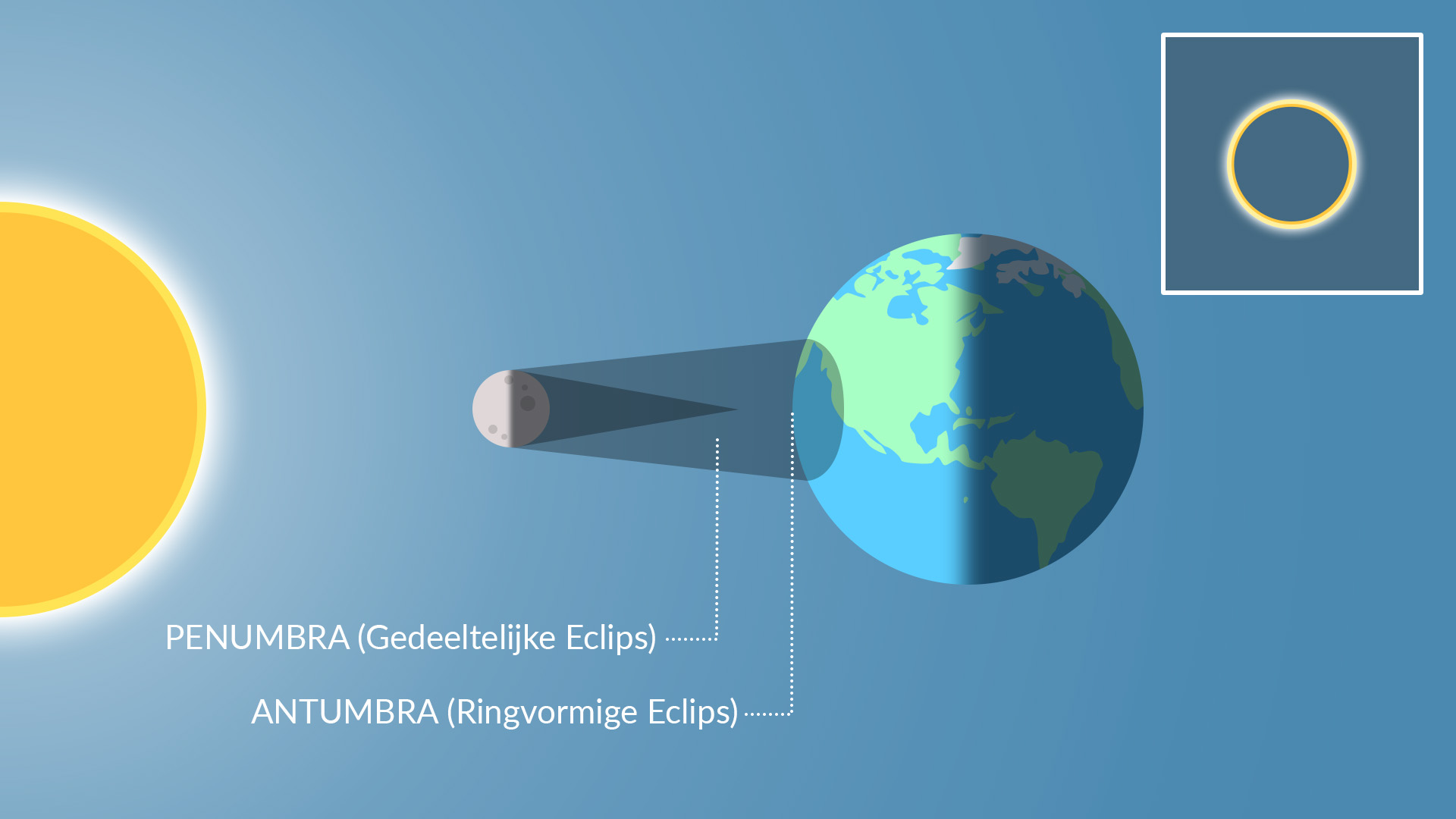 Een ringvormige zonsverduistering vindt plaats wanneer de Maan tussen de Zon en de Aarde passeert terwijl ze zich op het apogeum bevindt (de grootste afstand tot onze planeet) of daar dichtbij. Tijdens een ringvormige zonsverduistering werpt de Maan een tegenkernschaduw – een soort schaduw die alleen bestaat als de lichtbron een grotere diameter heeft dan het object dat de schaduw werpt. Wanneer de Maan ver van de Aarde is, is haar hoekgrootte te klein om de Zon volledig te bedekken. Daarom zien we de “ring van vuur” – een dunne ring van zonlicht rond de donkere maanschijf. Omdat de tegenkernschaduw altijd wordt omgeven door de bijschaduw, is een gedeeltelijke verduistering zichtbaar vanaf locaties die net buiten het annulariteitspad liggen.