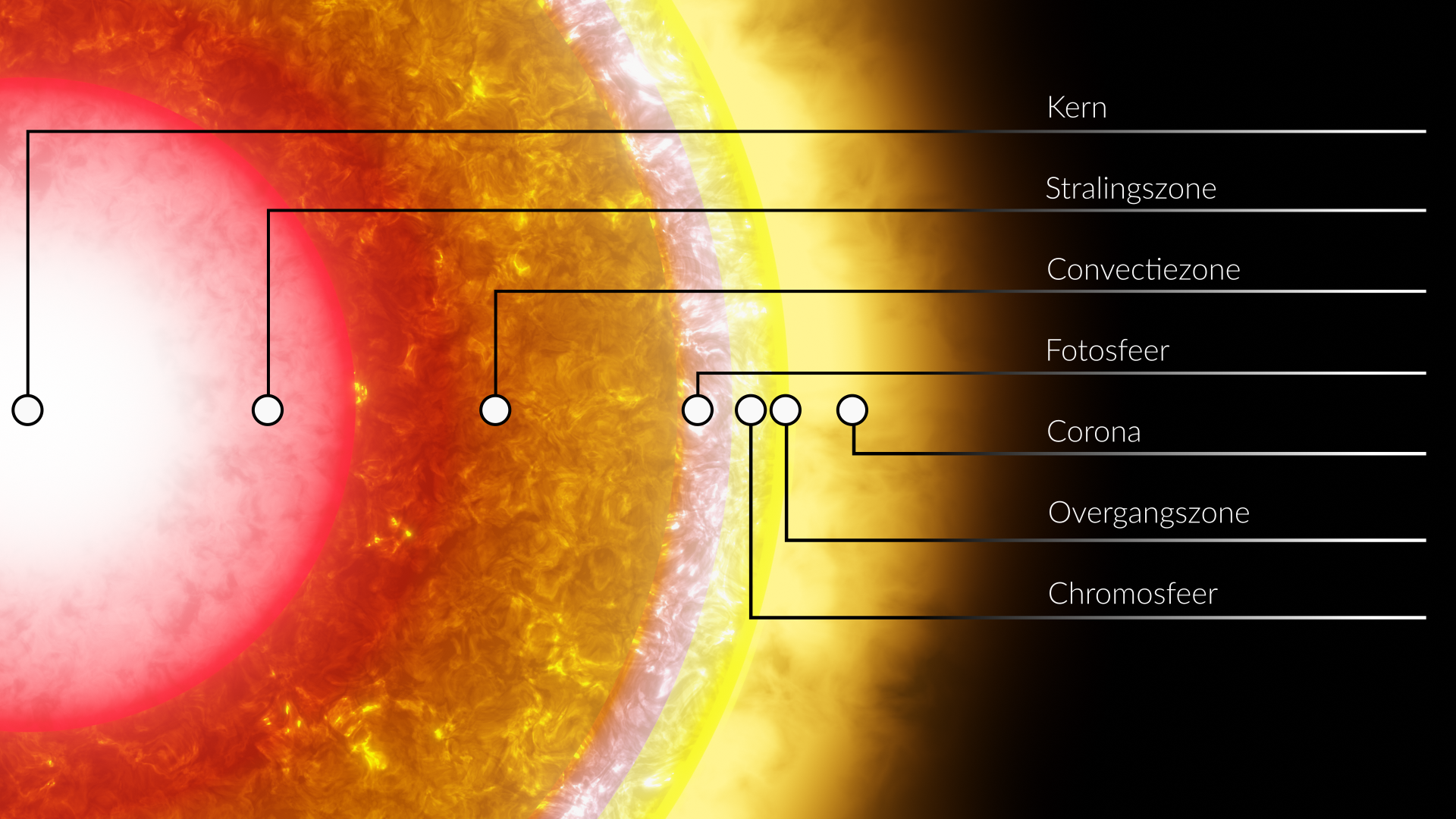 - Convectiezone: Een laag waarin energie wordt getransporteerd naar de fotosfeer door convectiestromen van verwarmde en gekoelde gassen.