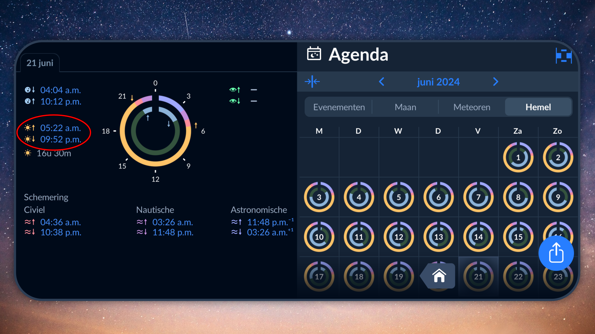 Als je de tijden van zonsopkomst en zonsondergang in jouw stad wilt weten of meer specifieke informatie zoals burgerlijke, astronomische en nautische schemeringstijden wilt raadplegen, bekijk dan de kalender van de Sky Tonight-app. Open het tabblad Sky en kies je voorkeursweergaveformaat (lijnen of cirkels). De tijden gemarkeerd in blauw zijn interactief - klik erop om te zien hoe de lucht er op dat moment uitziet.