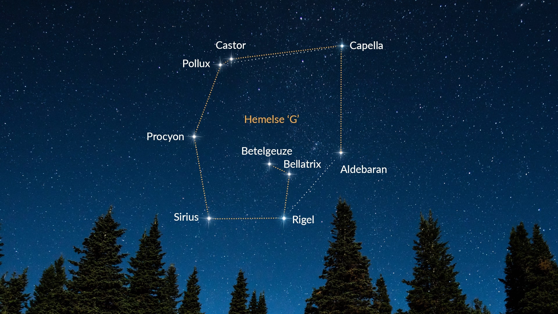 Het asterisme van de Hemelse G bevat in wezen dezelfde sterren als de Winterhexagoon; Castor en Betelgeuze zijn de enige nieuwe elementen. Om de "G"-vorm in de lucht te traceren, volg je het pad van acht heldere sterren. Begin bij Aldebaran en ga omhoog naar Capella in Voerman, passeer dan Castor en Pollux in Tweelingen. Ga vervolgens door naar Procyon en Sirius in Kleine Hond en Grote Hond, respectievelijk. Van Sirius, ga naar Rigel, en eindig tenslotte bij Betelgeuze in Orion.