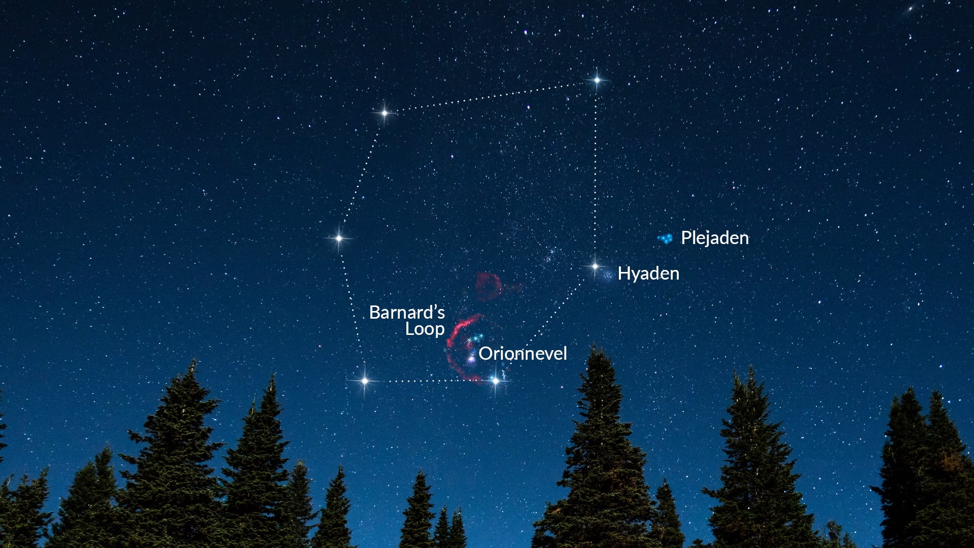 - Vind Aldebaran: trek een lijn door de sterren van de Gordel van Orion en rek deze naar het noorden uit om Aldebaran in Stier te vinden.