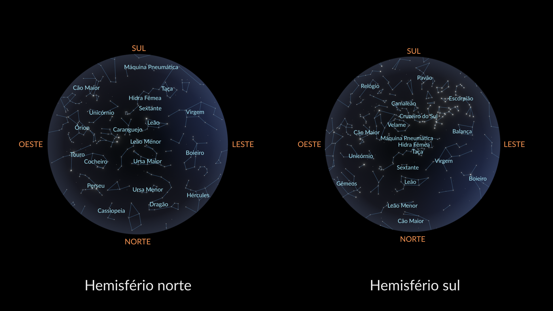 - Hemisfério Sul: Hydra, Crater, Antlia, Chamaeleon