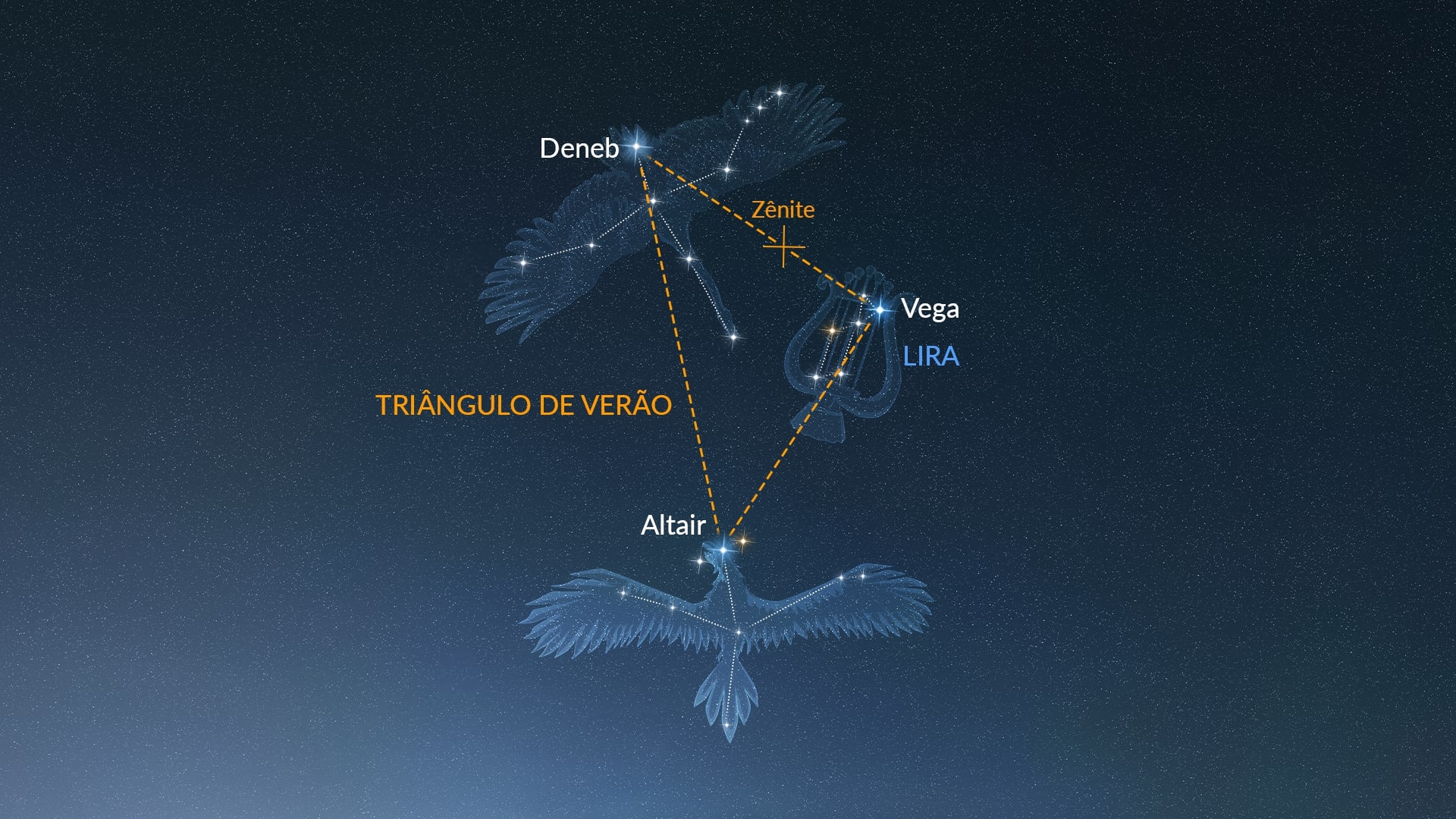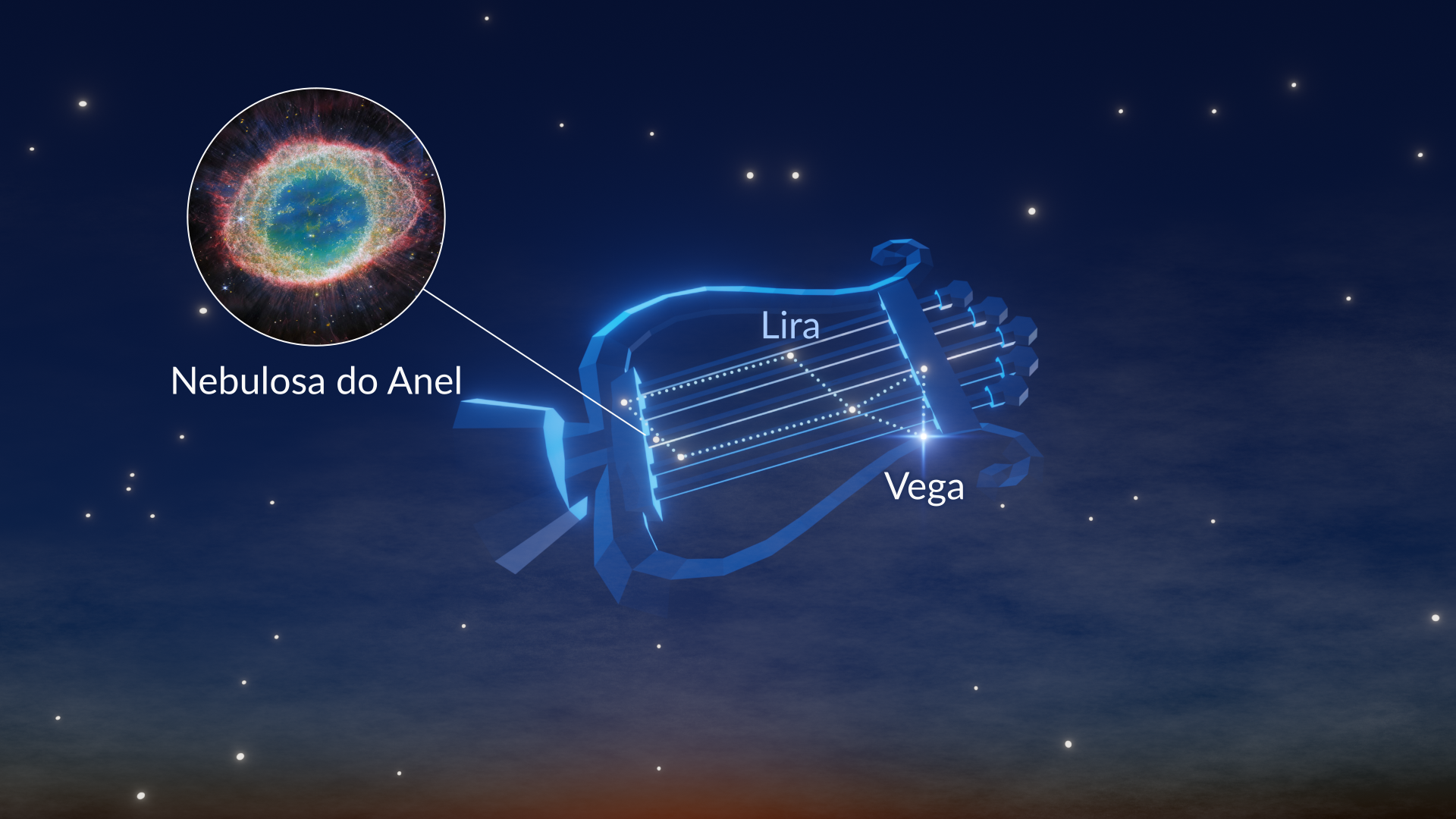 Olhe diretamente para cima em uma noite escura de verão no Hemisfério Norte e encontre Vega — a estrela mais brilhante próxima ao zênite. Depois que seus olhos se ajustarem à escuridão, você verá um pequeno paralelogramo de estrelas fracas pendurado em Vega, com um minúsculo triângulo conectado a um dos cantos — essa é a constelação de Lira. Vega também marca o ponto central do Triângulo de Verão, posicionando-se entre Deneb e Altair.