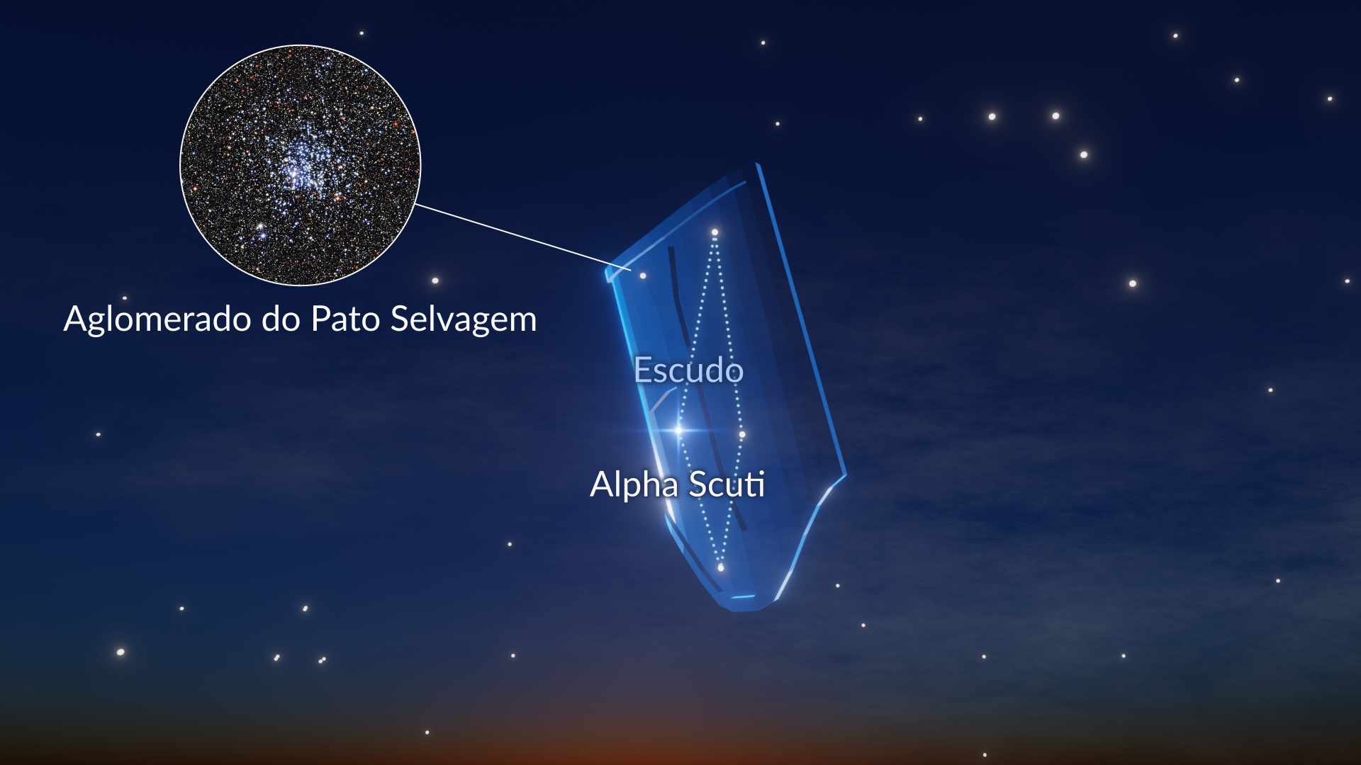 No Hemisfério Norte, olhe na direção do horizonte sul — Escudo aparece logo acima de Sagitário. Outra dica útil é a estrela Altair, a mais brilhante de Águia (Aquila), que marca o canto inferior do Triângulo de Verão. Escudo está aproximadamente na metade do caminho entre Altair e o Bule de Sagitário, ligeiramente a oeste.