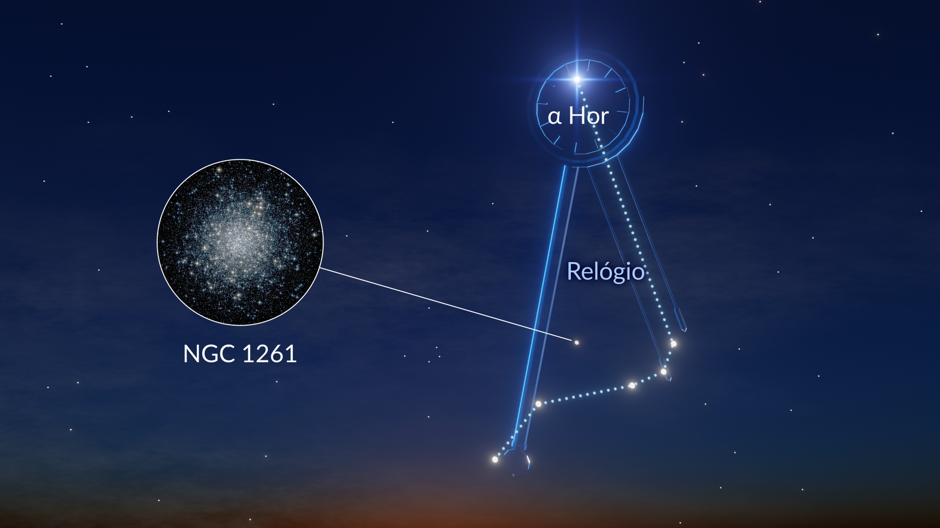 O principal padrão reconhecível de Horologium é formado por seis estrelas tênues, e apenas uma delas é mais brilhante que a magnitude 4. Por isso, você vai precisar de um céu escuro e sem Lua para ver todo o desenho com clareza.