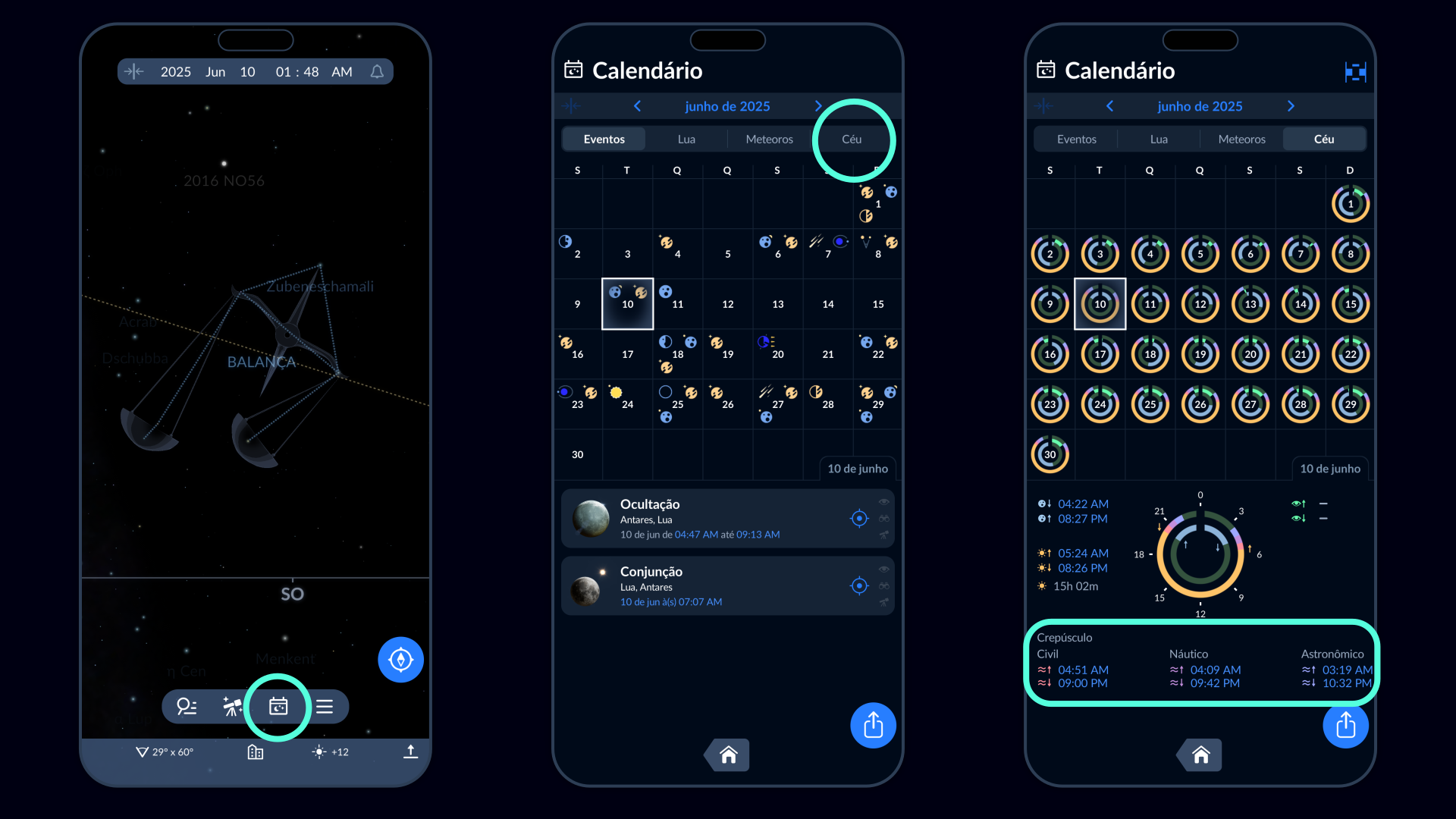 Para saber os horários de escuridão total na sua localização, utilize o app Sky Tonight. Abra o app, toque no ícone do calendário na parte inferior da tela e escolha a guia "Céu". O Sky Tonight mostrará os horários de início e de fim de escuridão total e sua duração.