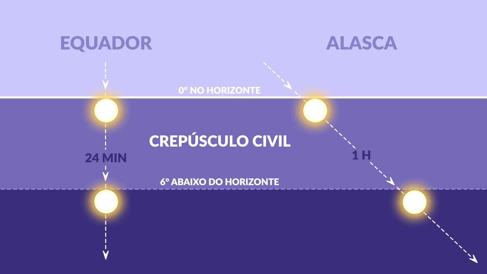Imagine o crepúsculo como o período em que o Sol atravessa uma faixa estreita próxima ao horizonte, com cerca de 18° de largura, que dividimos em três segmentos de 6°. A duração depende da velocidade com que o Sol parece atravessar essa faixa.