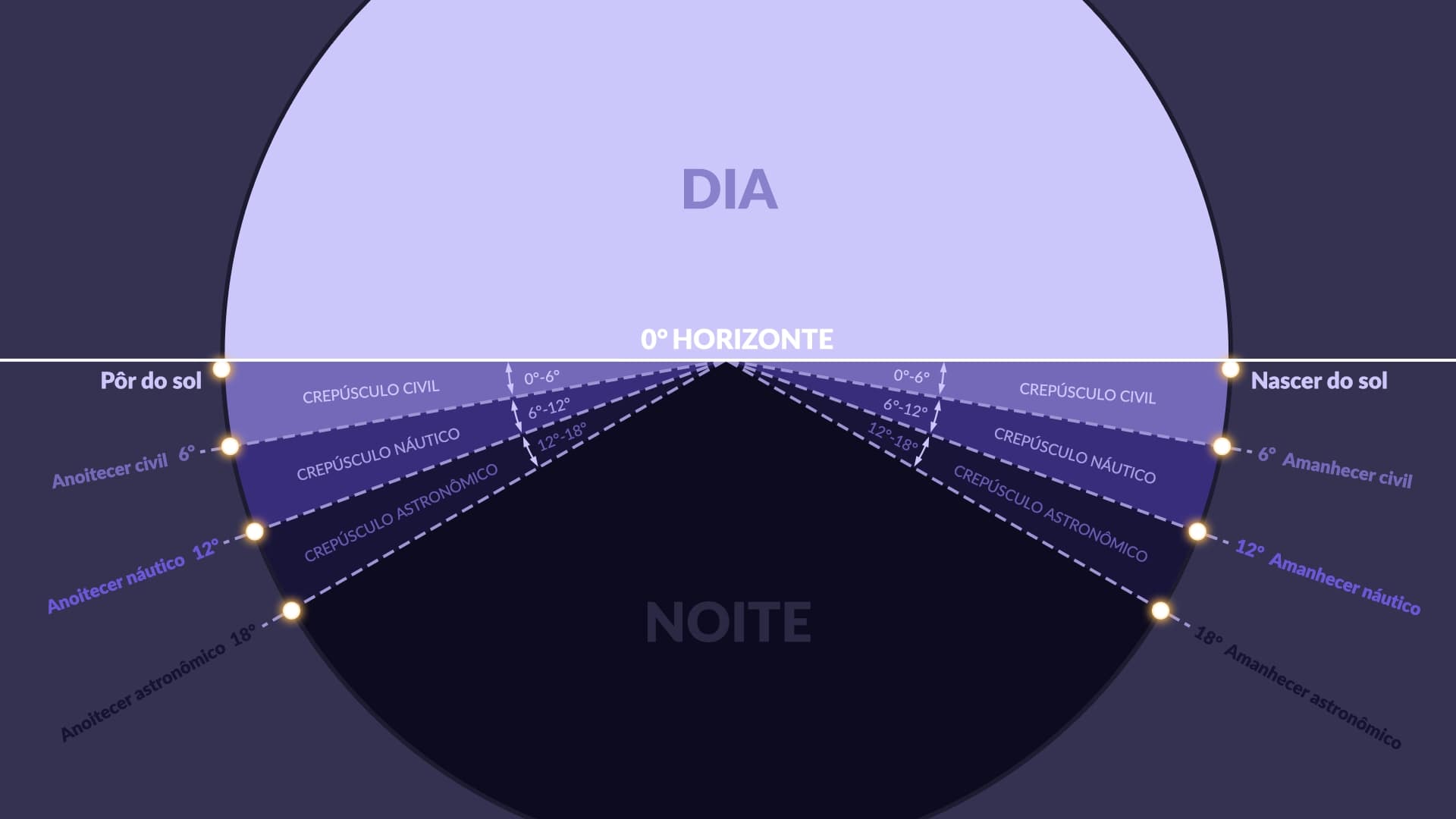 - Crepúsculo vespertino/matutino astronômico: 18°