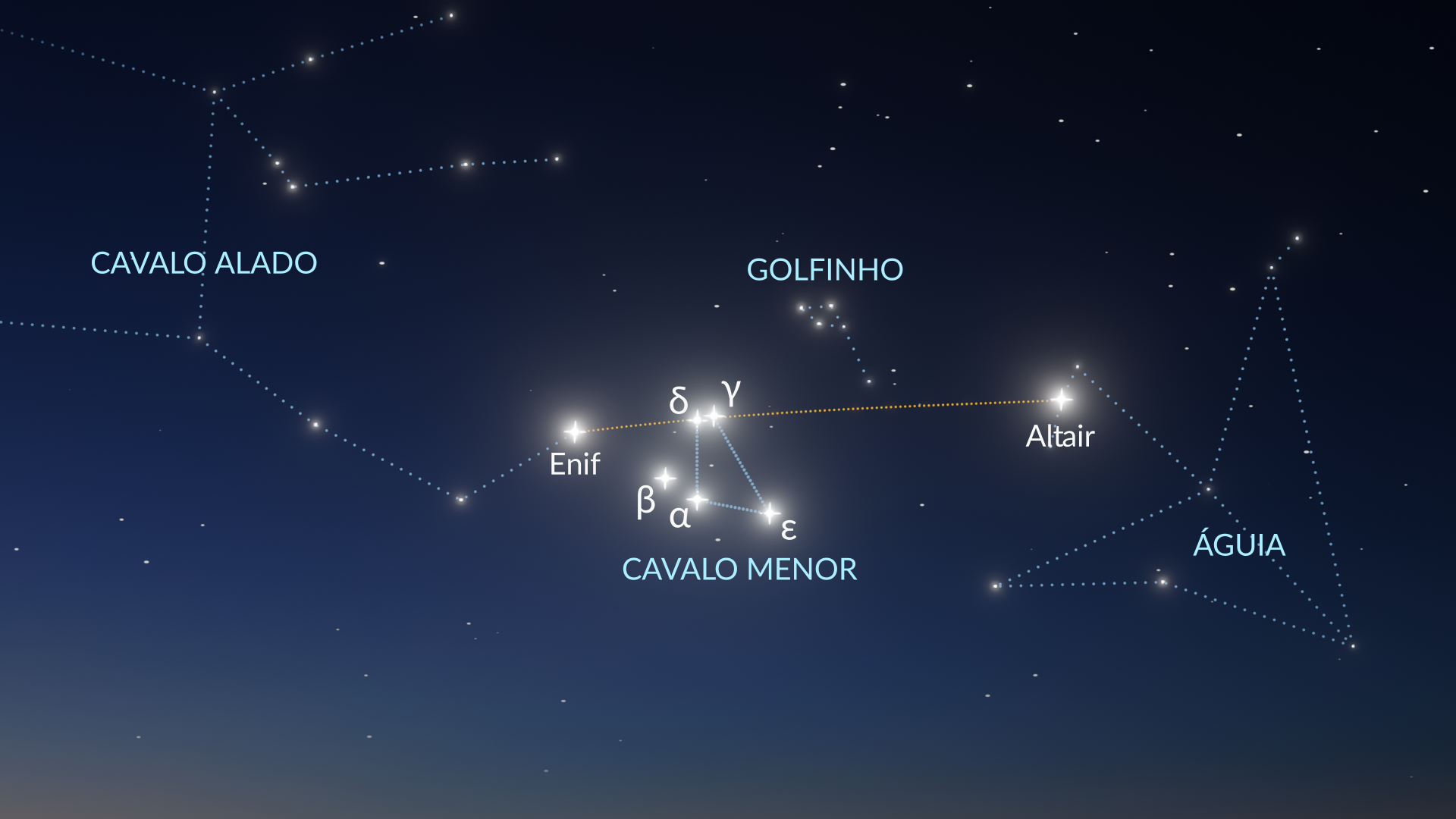 Enif é fácil de achar — ela fica a oeste do Grande Quadrado de Pégaso, um asterismo grande e bem destacado dentro da constelação de Pégaso. Altair é uma das estrelas mais brilhantes do céu noturno e forma um dos vértices do Triângulo de Verão, junto com Vega e Deneb. O Triângulo de Verão brilha bem alto durante as noites de verão e outono no Hemisfério Norte. Você também pode identificar Altair pelas duas “companheiras” mais fracas, Tarazed e Alshain, que ficam uma de cada lado.