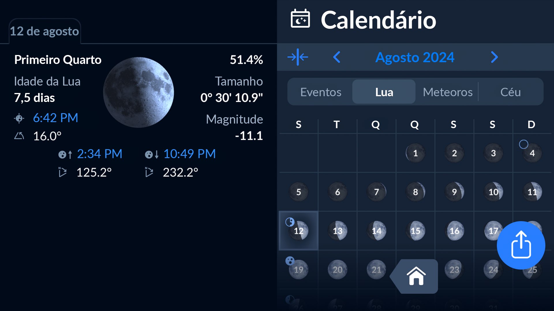 Outra forma é usar o recurso de calendário lunar no aplicativo Sky Tonight. Simplesmente toque no ícone do calendário na tela principal, selecione a aba da Lua e navegue pelas datas para descobrir detalhes como fase lunar, brilho, horários de nascer e pôr da lua para sua localização, e mais. Como bônus, as imagens acompanhantes da Lua retratam com precisão como nosso satélite natural se parece nesta data em sua localização. Explore o recurso por si mesmo!
