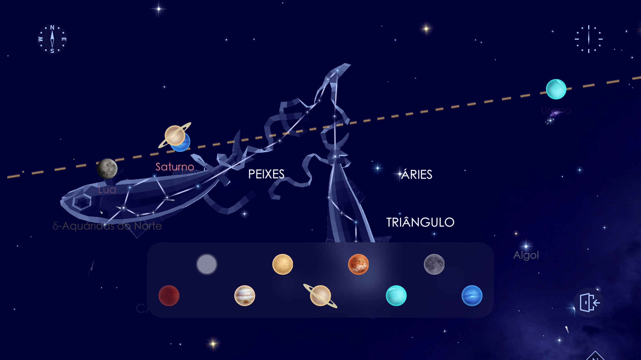 - Saturno (Peixes): Em movimento retrógrado, é visível a partir da meia-noite no começo do mês e a noite toda no final. Seu brilho aumenta levemente de 0.8 para 0.7.