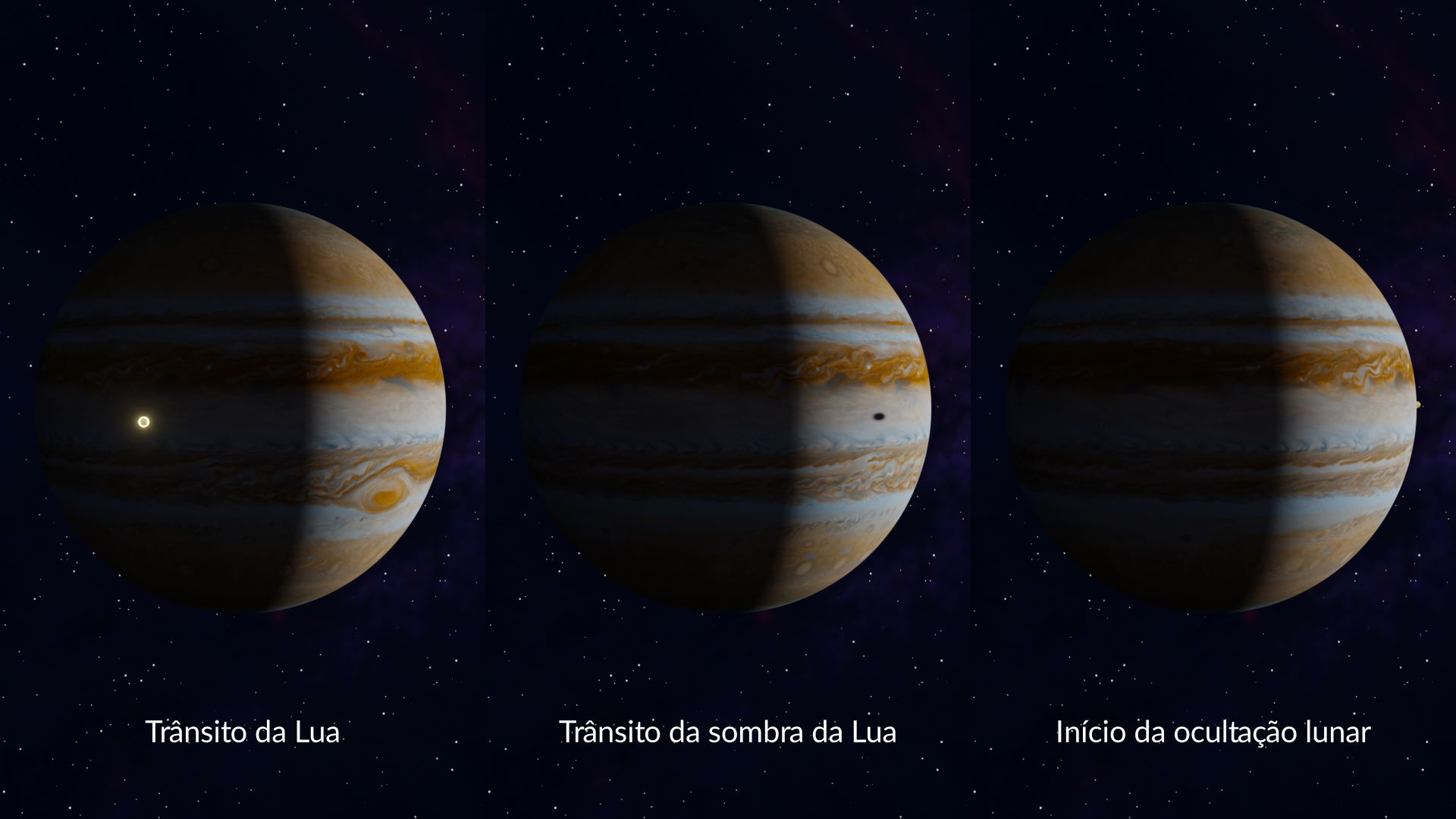 - Ocultação: uma lua passa atrás de Júpiter e desaparece por algum tempo do seu ponto de vista.