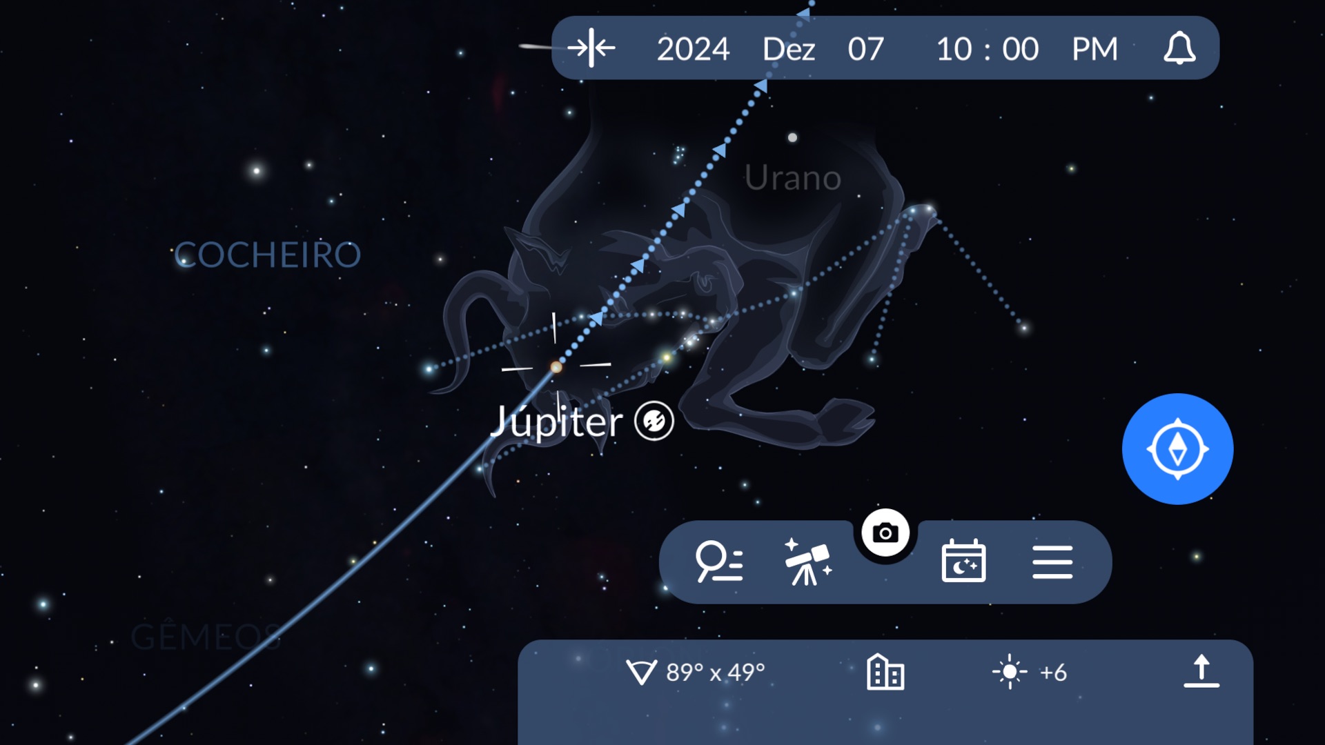 A maneira mais fácil de encontrar Júpiter no céu é usar o aplicativo gratuito de observação de estrelas Sky Tonight. Apenas toque no ícone da lupa, digite “Júpiter” no campo de busca e toque no ícone de alvo ao lado do resultado correspondente. O aplicativo mostrará a posição do planeta no seu céu.