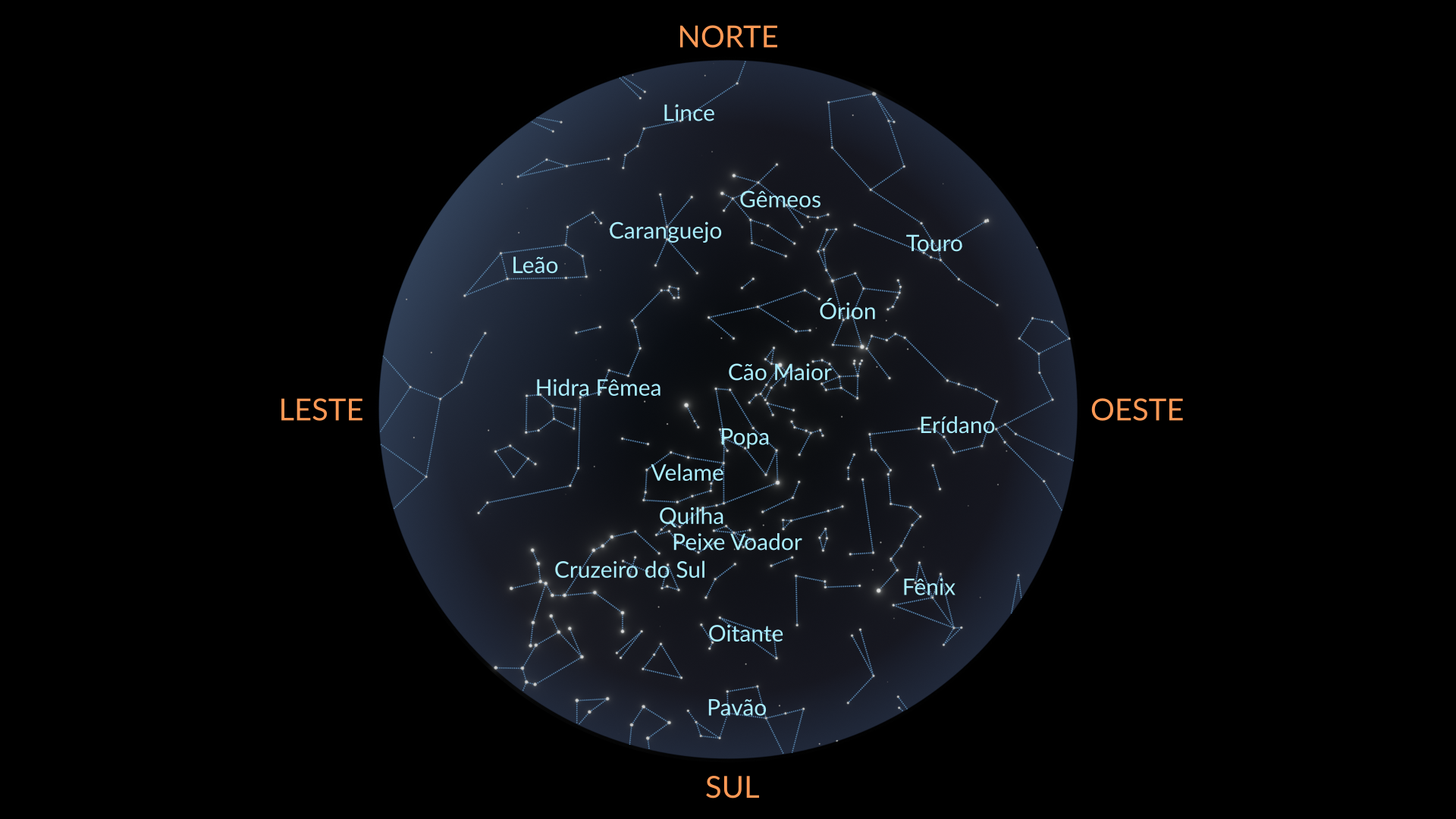 Note que algumas das constelações listadas podem não ser visíveis a partir da sua localização. Mais adiante no artigo, forneceremos as latitudes de onde elas são visíveis.