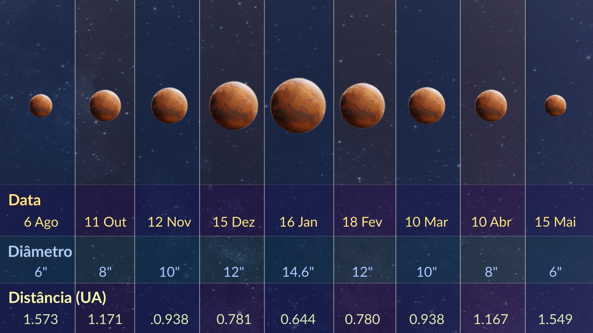 - O Planeta Vermelho também aparecerá no maior tamanho no céu: seu tamanho angular será de 14,6 segundos de arco, quase 2,5 vezes maior que o tamanho aparente do planeta em agosto de 2024. Isso porque, recentemente, em 12 de janeiro, Marte atingiu o periélio, ou seu ponto mais próximo da Terra. Confira a imagem abaixo para ver como o tamanho aparente de Marte muda de mês a mês.