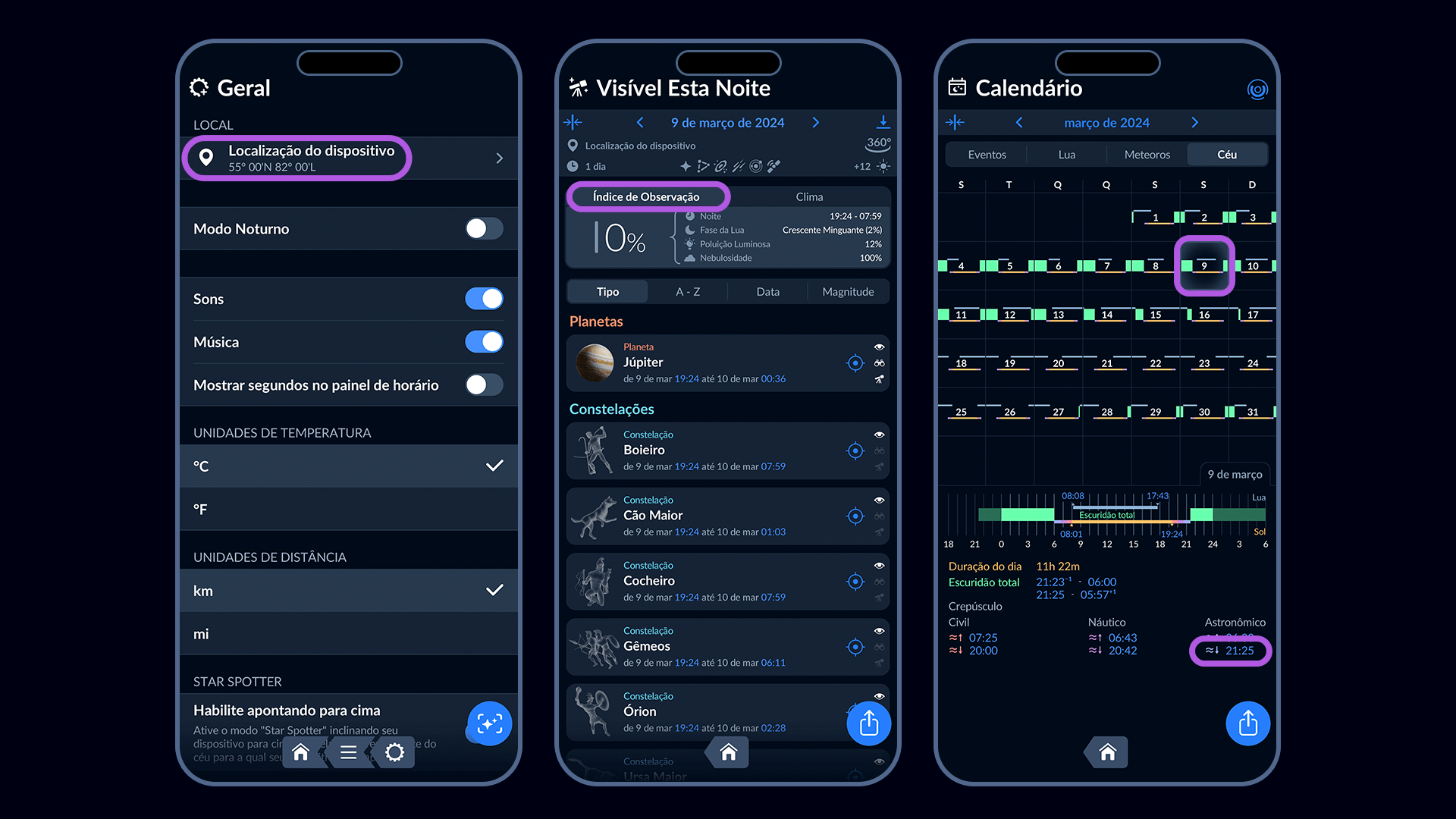 - Descubra quando começa o crepúsculo astronômico na sua área. Vá para o recurso Calendário, selecione a aba Sky, e procure pelo horário de início do crepúsculo astronômico para a data desejada. Esse é o momento em que você deve estar pronto para observar.