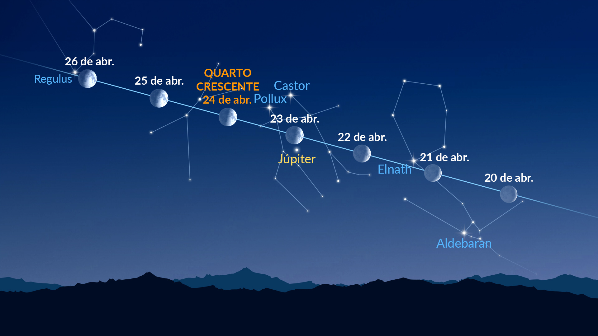 Em 20 de maio, a Lua crescente aparecerá perto de Júpiter (mag –1,9) na constelação de Gêmeos. Procure-os depois do pôr do sol acima do horizonte oeste. Os dois objetos serão fáceis de ver a olho nu. Perto dali, as estrelas brilhantes Castor e Pólux também estarão visíveis, deixando a cena ainda mais bonita.