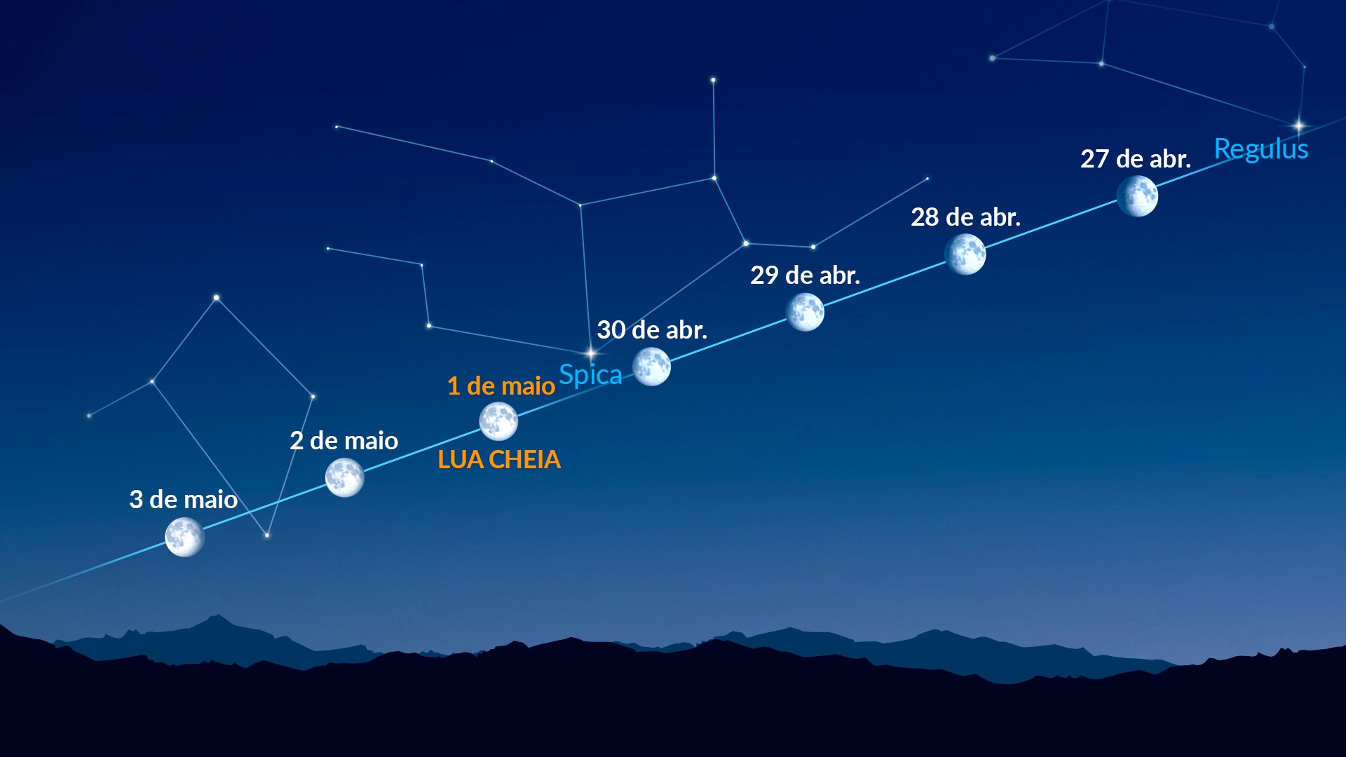 De 27 de abril a 3 de maio de 2026, a Lua passará pelas constelações de Leão, Virgem e Balança. As estrelas mais proeminentes perto do nosso satélite natural serão Régulo (mag 1.4), de Leão, e Espiga (mag 1.0), de Virgem.