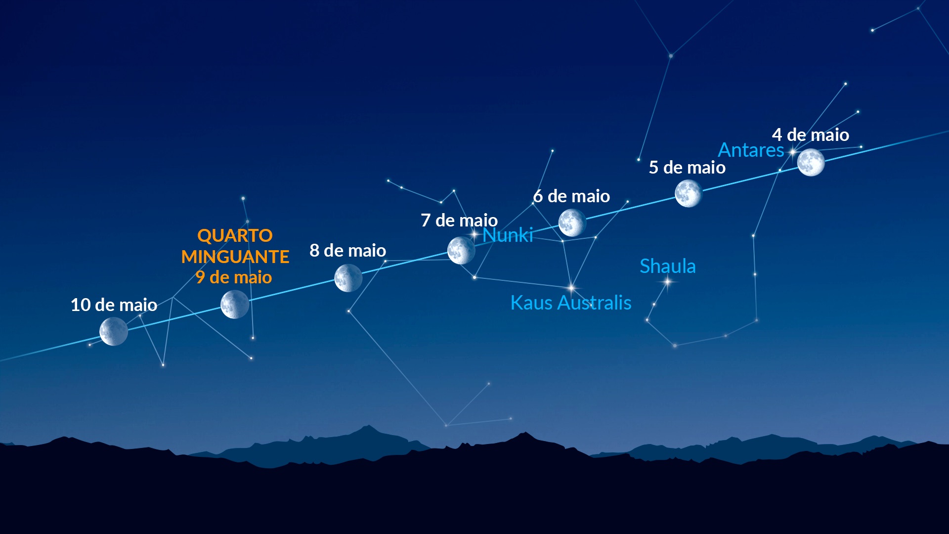 De 4 a 10 de maio de 2026, a Lua passará pelas constelações de Escorpião, Ofiúco, Sagitário, Capricórnio e Aquário. Nesta semana, os objetos mais destacados perto do nosso satélite natural serão: