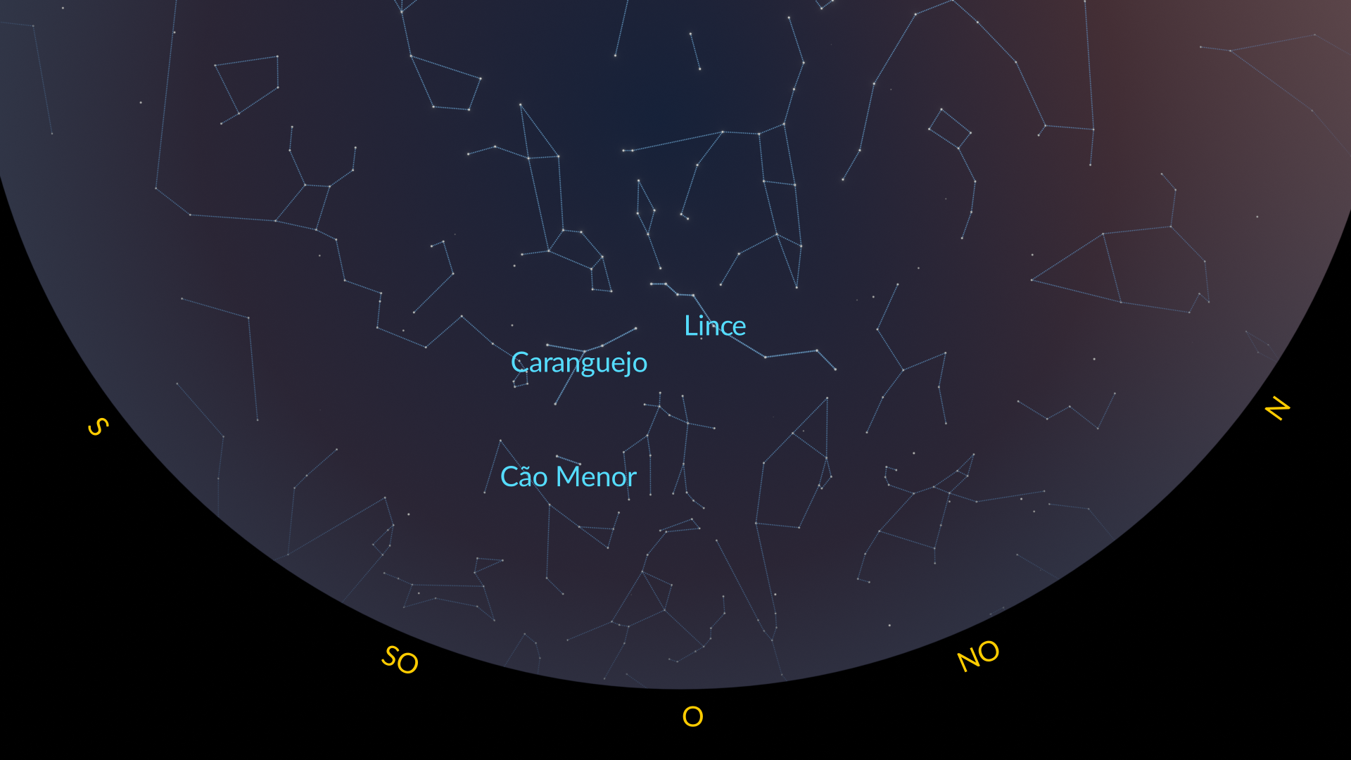 - C/2024 E1 (Wierzchos) está enfraquecendo gradualmente. Ele começa o mês perto de magnitude 9 e continua a perder brilho à medida que se afasta da Terra. O cometa é visível dos dois hemisférios: no Hemisfério Norte, aparece muito baixo acima do horizonte sudoeste cerca de uma hora após o pôr do sol (melhor a partir de latitudes em torno de 42°N e mais ao sul), enquanto no Hemisfério Sul fica mais alto no céu sudoeste após o anoitecer.