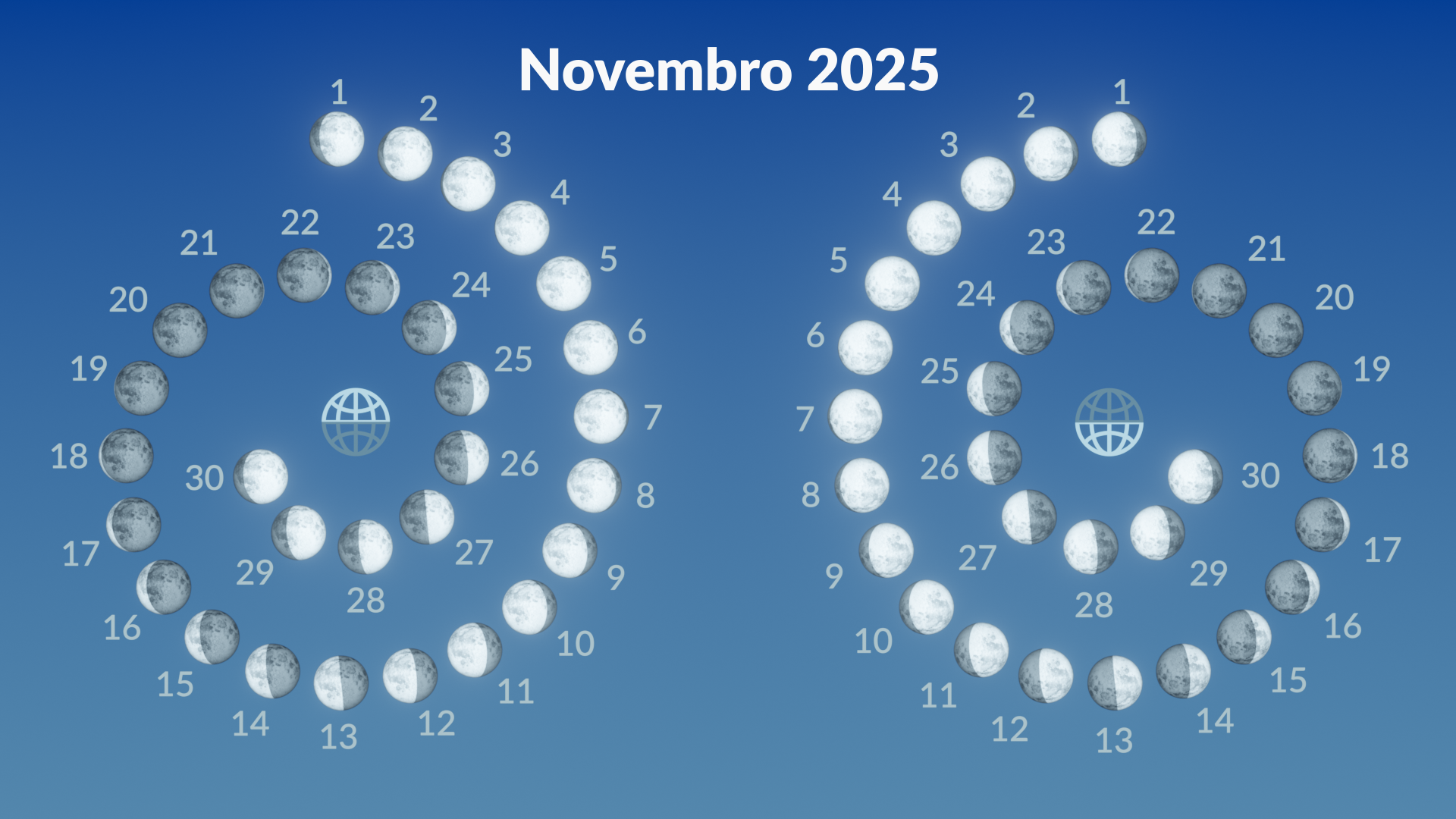 A Lua Nova ocorre em 20 de novembro às 06:47 GMT, trazendo a noite mais escura do mês — perfeita para observar as estrelas. Essa é a melhor oportunidade para ver alguns dos mais belos objetos de céu profundo de novembro, como as Plêiades, as Híades e a Galáxia de Andrômeda. Além disso, a chuva de meteoros Leonídeos atinge o pico três dias antes, e na noite de 19 para 20 de novembro espera-se uma atividade aumentada — talvez você consiga ver algumas “estrelas cadentes” sob um céu completamente escuro!