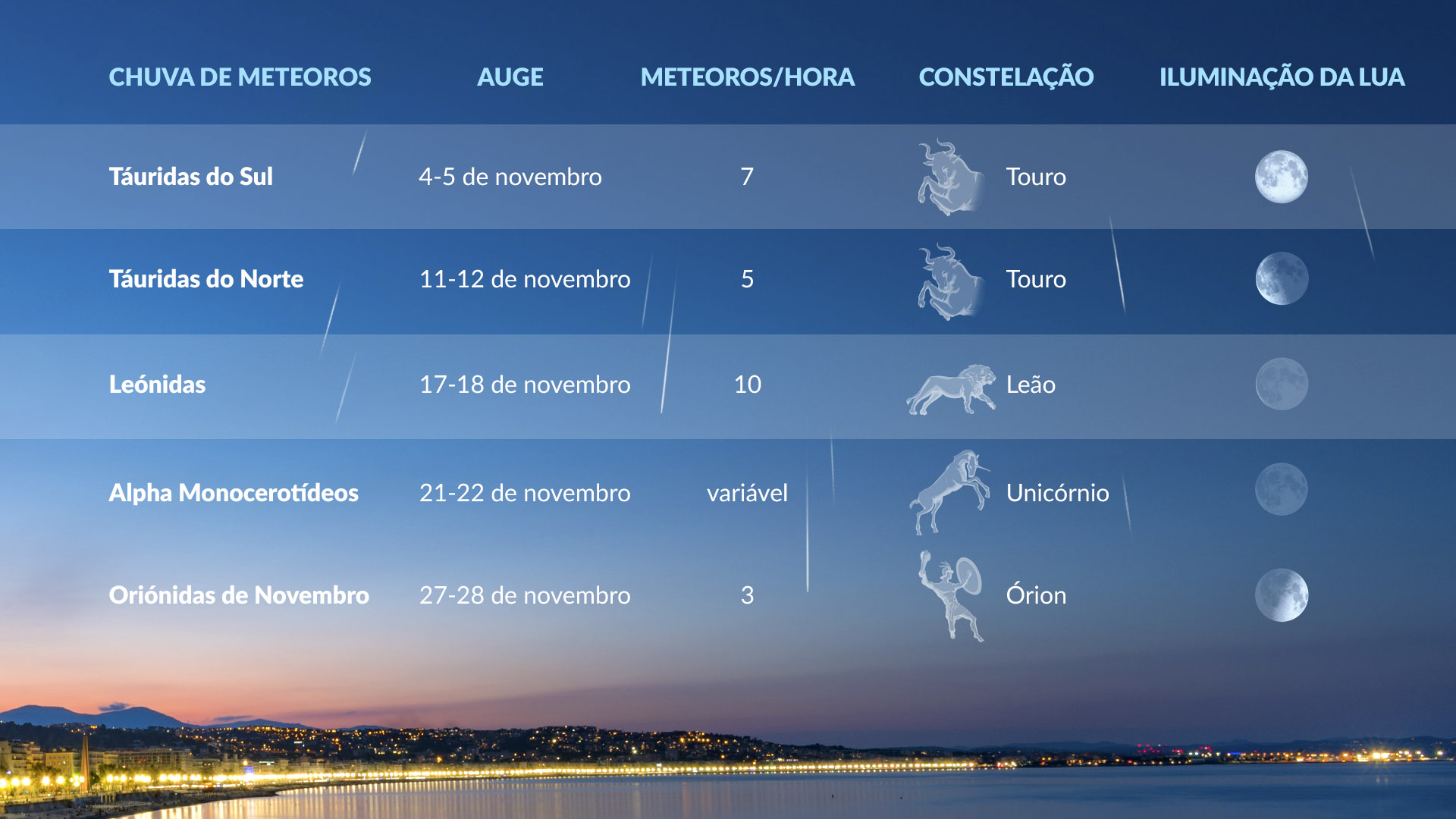 Cinco chuvas de meteoros atingirão seus picos neste mês. São elas: Táuridas do Sul, Táuridas do Norte, Leonídeos, α-Monocerotídeas e Oriônidas de Novembro, com os Leonídeos sendo a mais prolífica.
