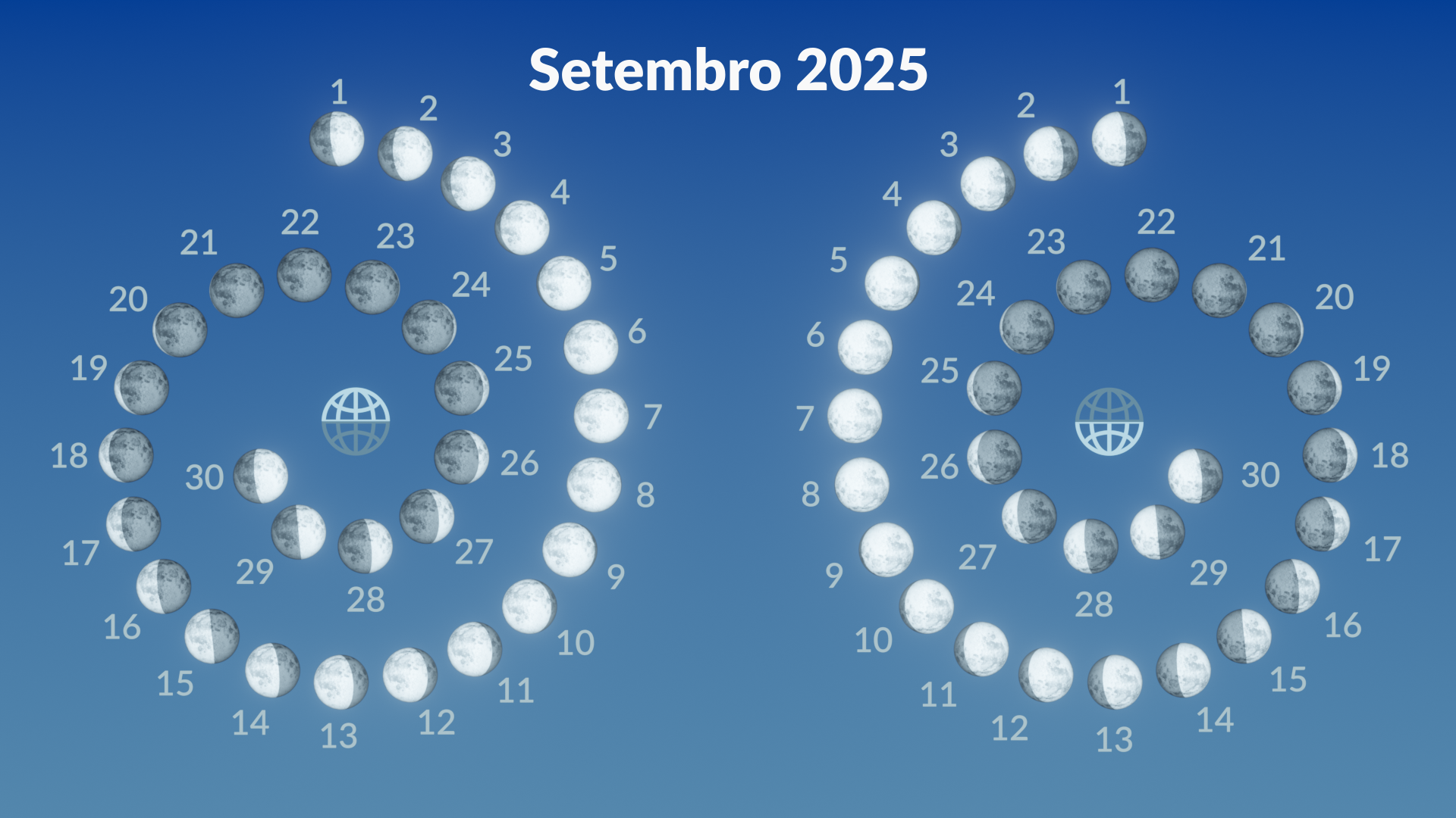 A Lua Nova ocorre em 21 de setembro às 19:54 GMT. Ela coincide com um eclipse solar parcial visível em partes da Austrália, Nova Zelândia, Antártica e Ilhas do Pacífico. Embora o eclipse seja o destaque para quem estiver nessas regiões, o verdadeiro presente para todos é o céu noturno sem luz lunar. Essa é a oportunidade ideal para explorar os ricos campos estelares da Via Láctea, ou fotografar nebulosas, aglomerados estelares e galáxias sem interferência da luz da Lua.