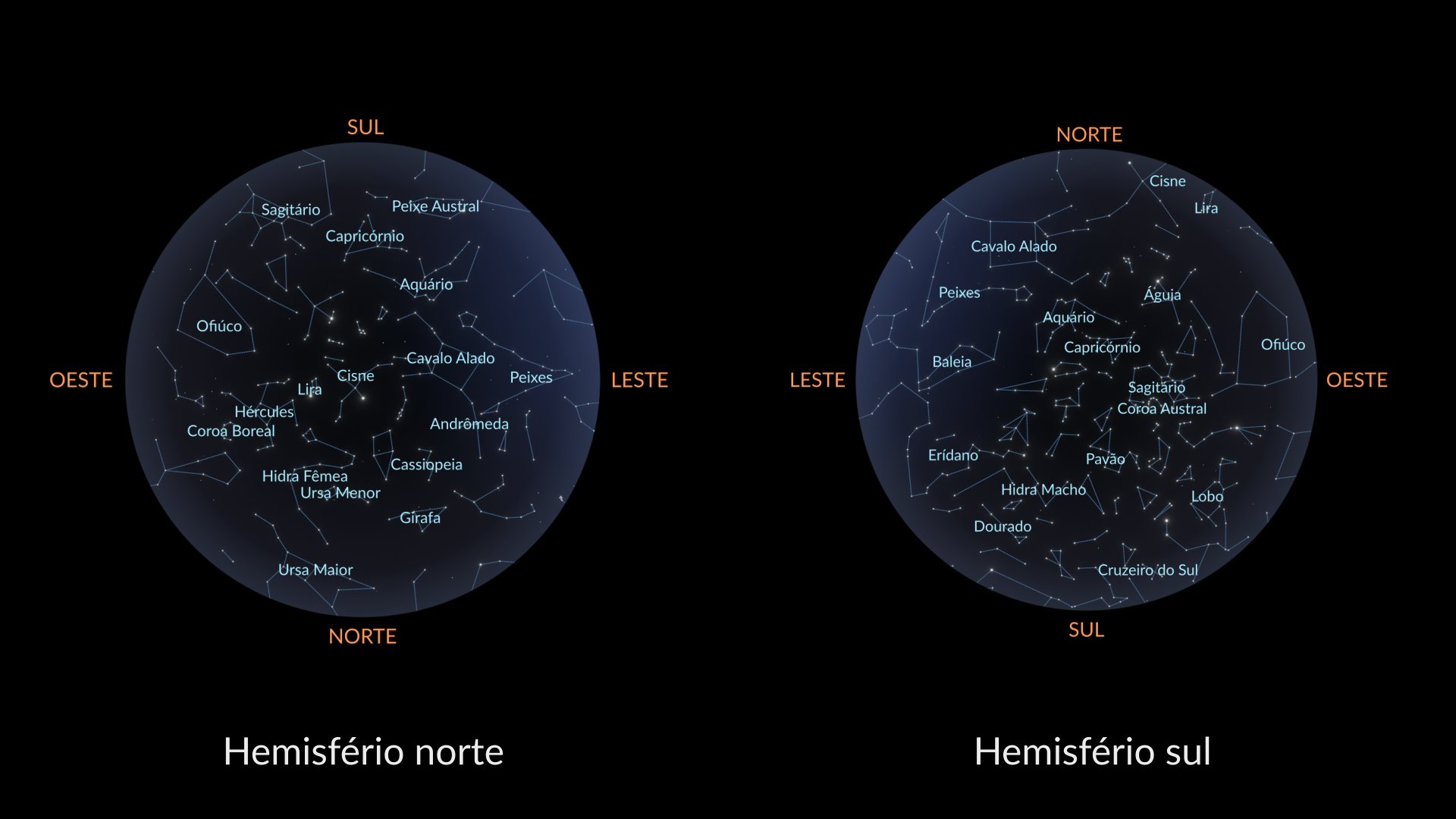 Em setembro, os dois hemisférios podem aproveitar uma variedade de constelações notáveis. Procure as constelações da família do zodíaco ao longo da eclíptica: Peixes, Aquário, Capricórnio e Sagitário são bem visíveis em ambos os hemisférios, enquanto Escorpião continua sendo um destaque no Hemisfério Sul. A “13ª constelação do zodíaco”, Ofiúco, também pode ser facilmente identificada em todo o mundo.
