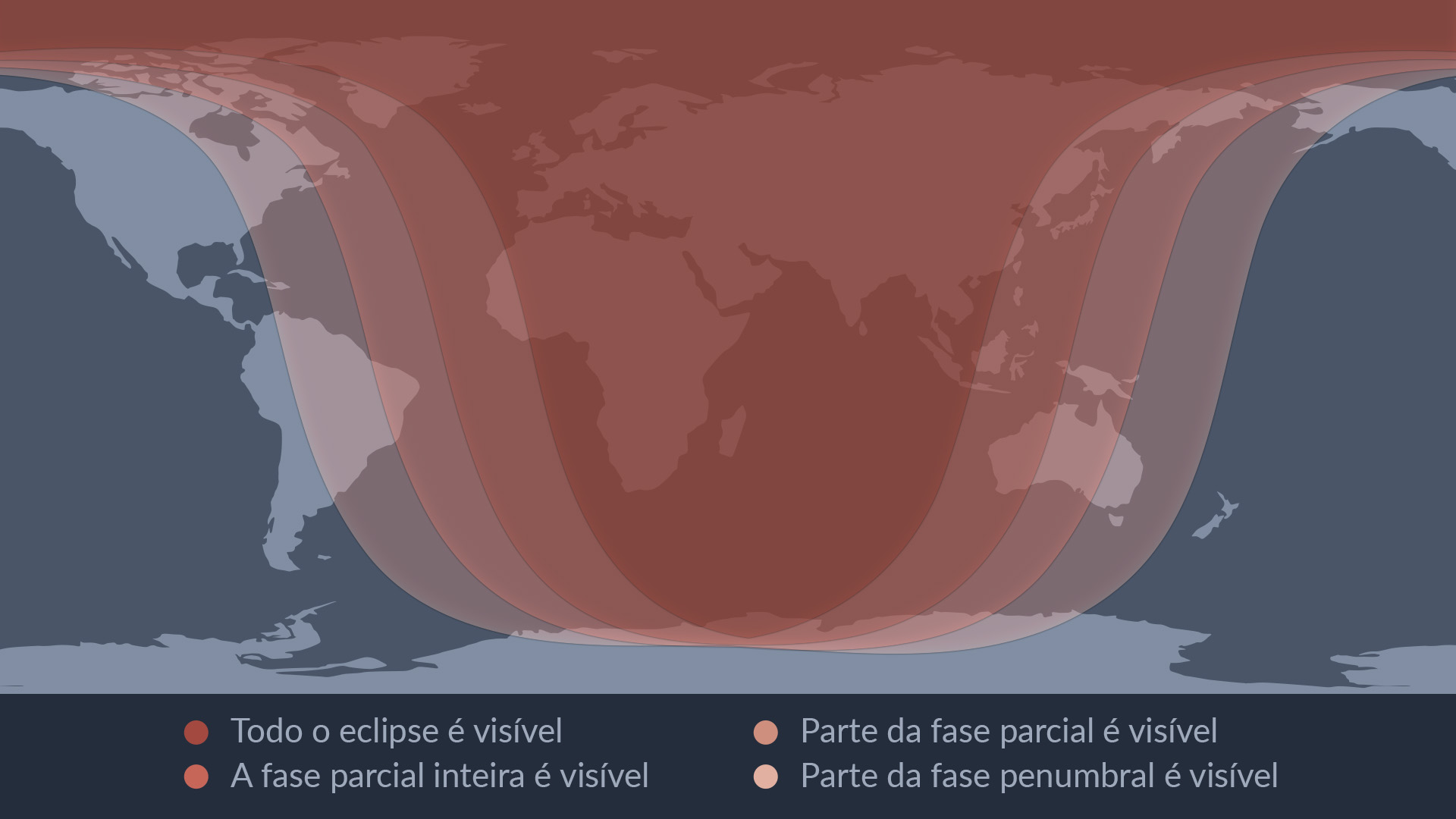 O eclipse completo será visível a partir do Leste das Américas, Europa, África, Ásia e Austrália.