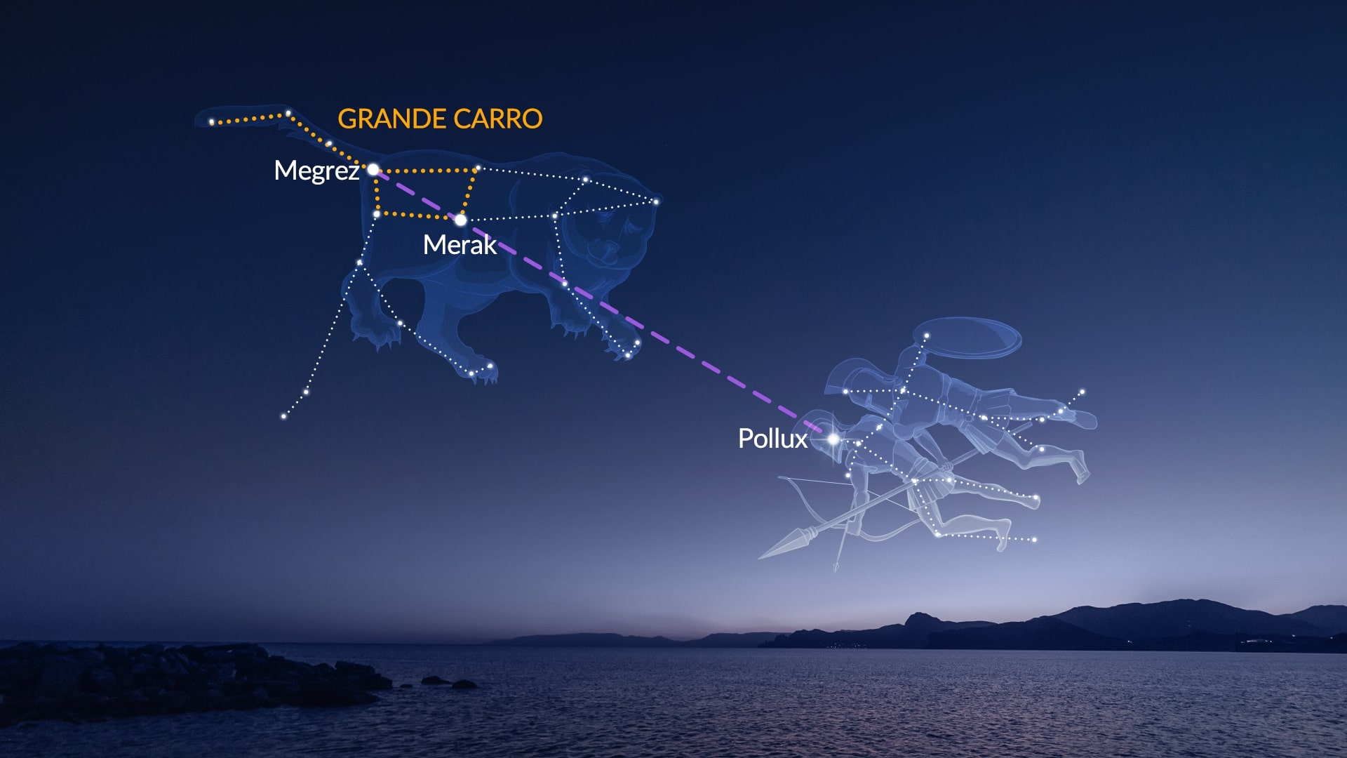 Uma maneira de localizar Pólux é usando a Ursa Maior – um dos padrões estelares mais reconhecíveis do céu. Trace uma linha pela “tigela” da Ursa, da estrela Megrez (onde a “tigela” e a “alça” se encontram) passando por Merak (na base da “tigela”, diagonalmente oposta a Megrez) e siga até encontrar duas estrelas brilhando próximas. Serão Pólux e sua “estrela gêmea” Castor.