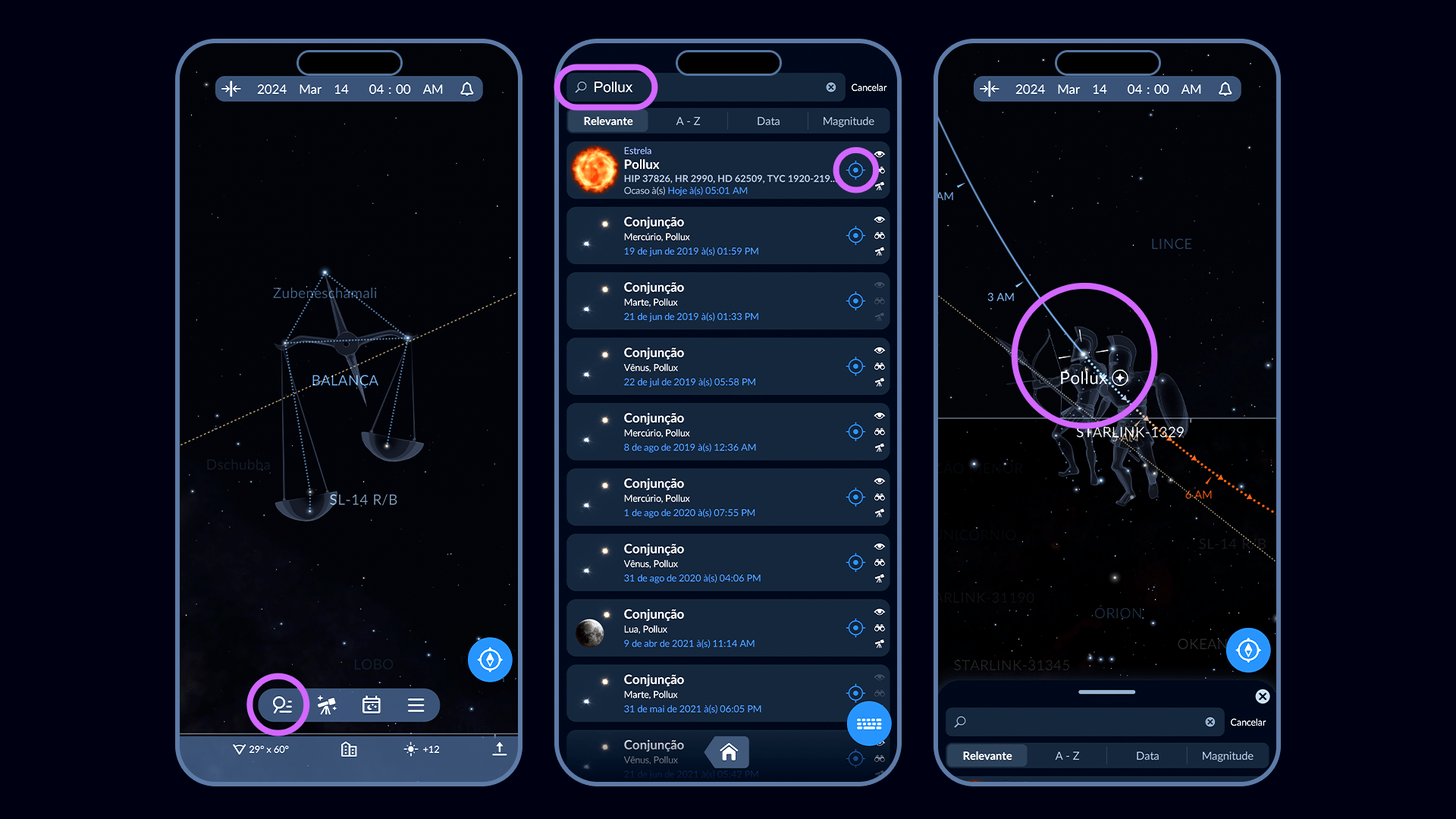 Outra maneira de encontrar Pólux é usando um app de observação do céu, como o Sky Tonight. Com ele, você verifica a localização da estrela em poucos toques. Veja a imagem abaixo ou siga o guia em vídeo e comprove como é simples!