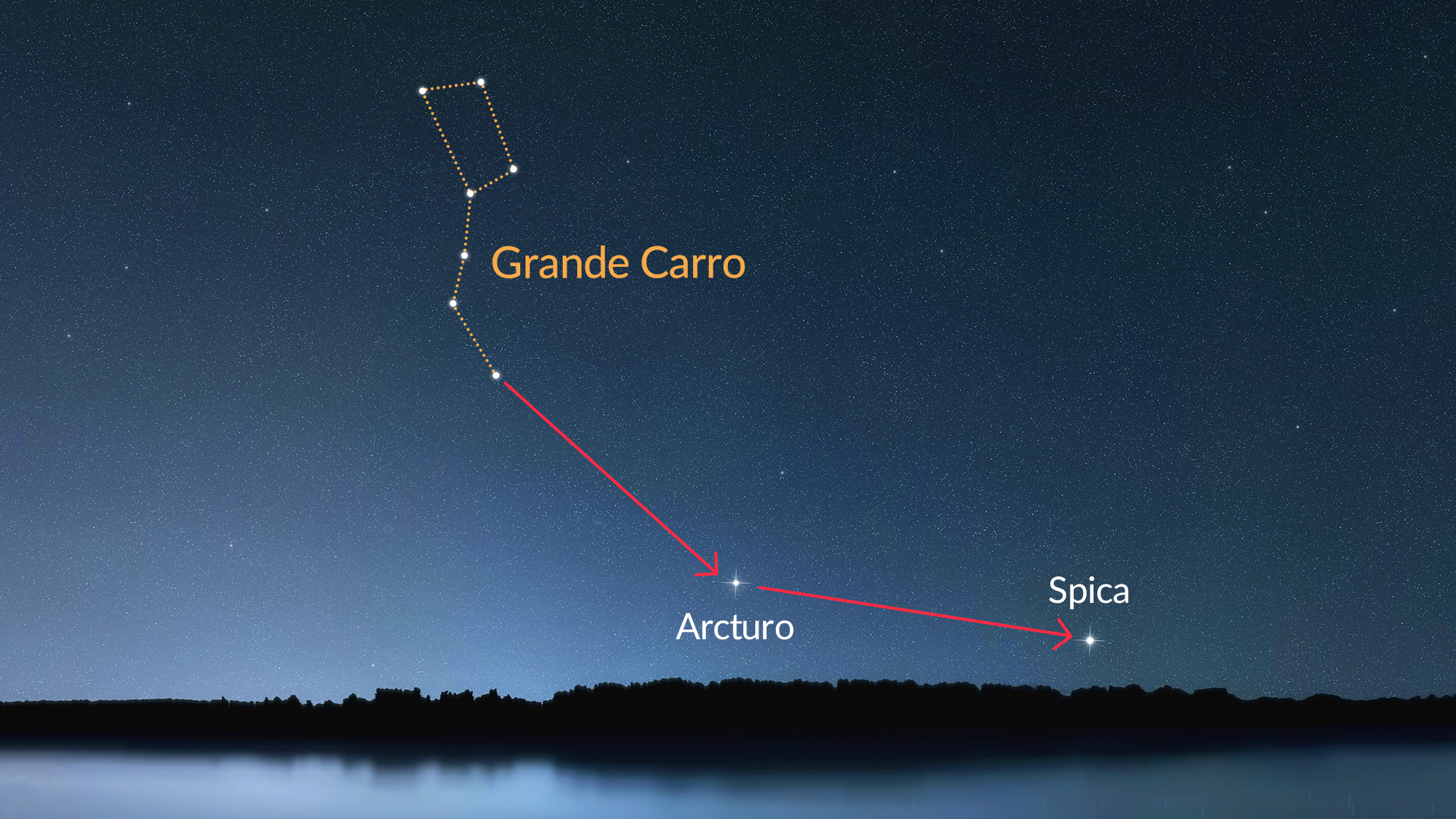 Uma maneira de localizar Spica é usando a Ursa Maior – um dos padrões de estrelas mais reconhecíveis no céu. Estenda a curva da alça da Ursa Maior para encontrar Arcturus, e então continue a linha aproximadamente a mesma distância novamente para alcançar Spica.