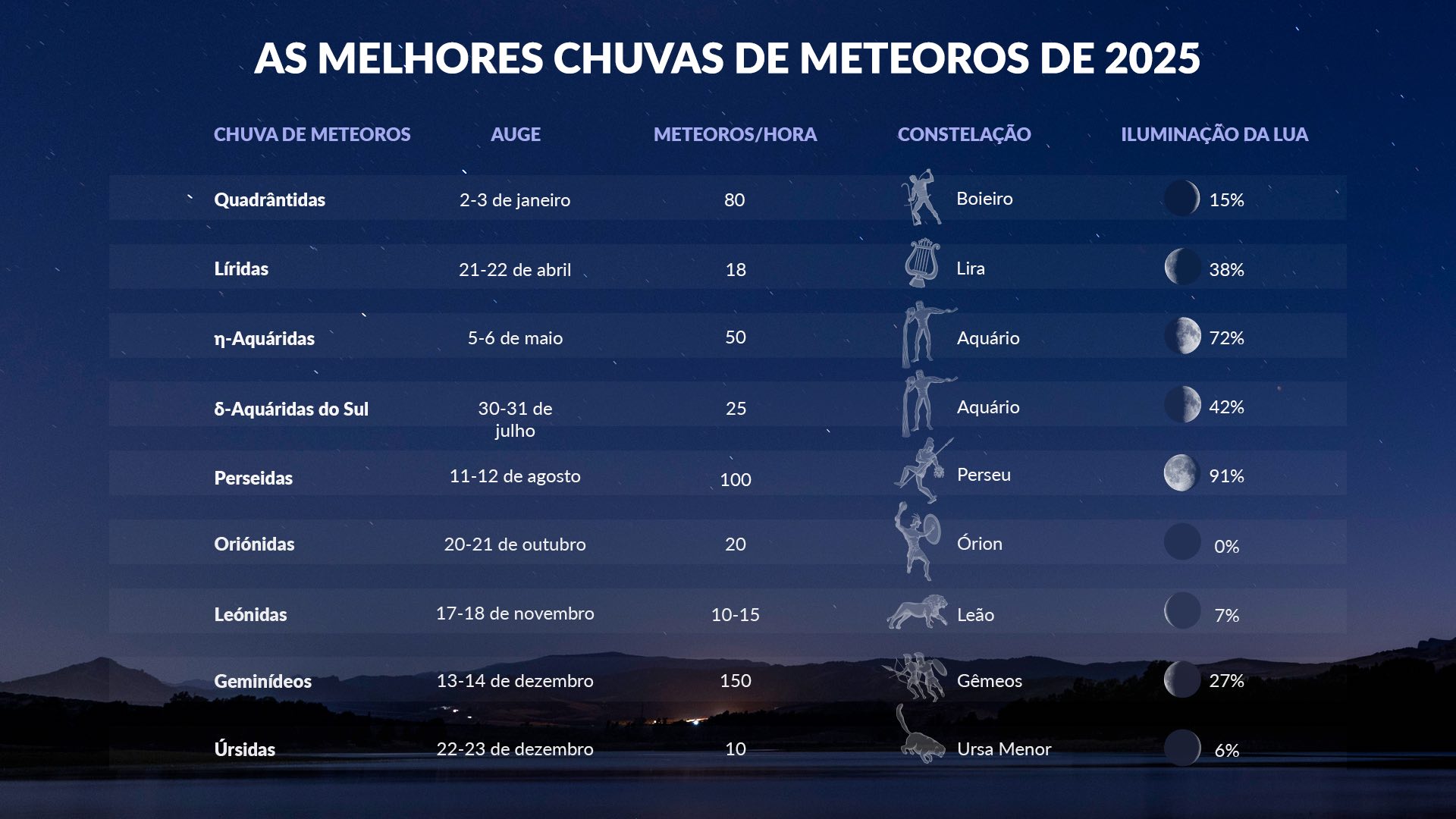 Aqui está uma lista das chuvas de meteoros mais proeminentes com datas de pico para 2025. Essas chuvas ocorrem aproximadamente na mesma época todo ano. Clique nos links para explorar os detalhes de cada uma delas.