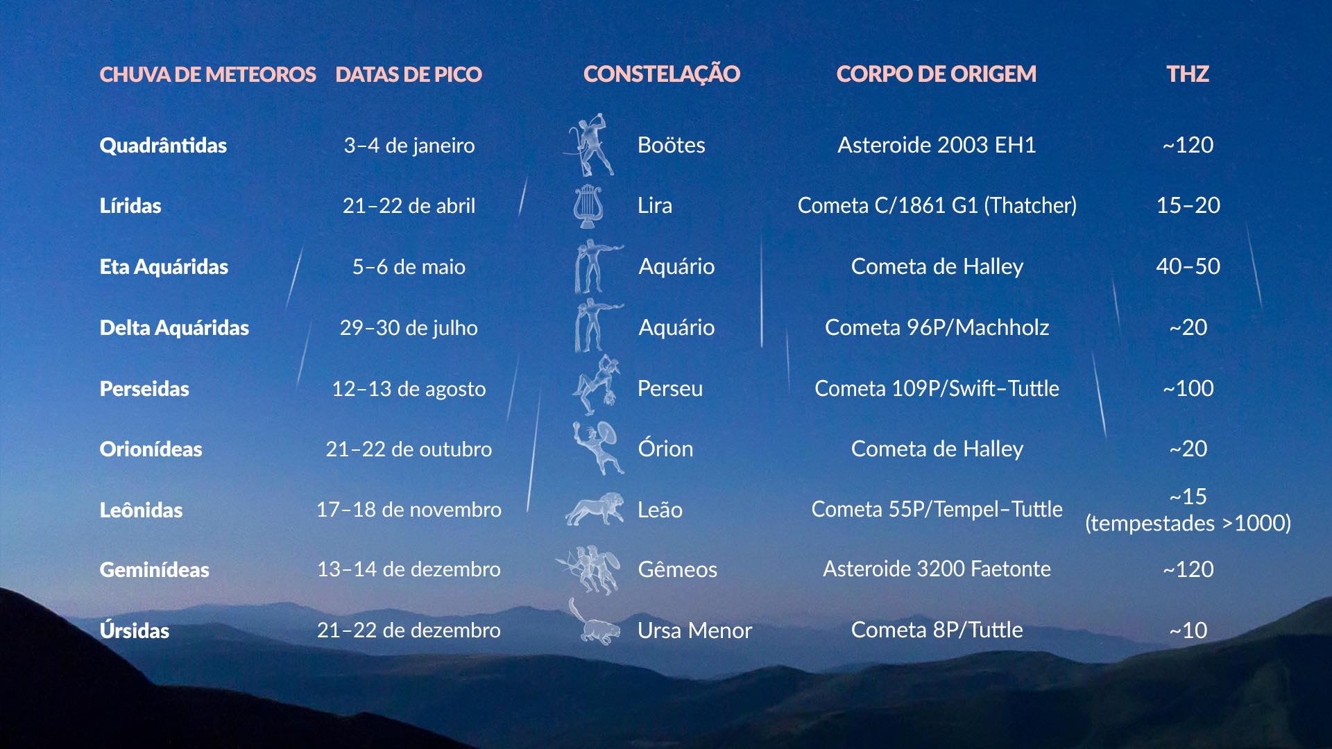 Todos os anos, a Terra cruza diversos fluxos conhecidos de detritos cometários ou asteroides, que produzem chuvas de meteoros previsíveis. Seus períodos de atividade, noites de pico e intensidade variam, mas cada uma possui um radiante característico (ponto aparente de origem no céu) e um corpo-mãe identificado. O ZHR (taxa horária zenital) indica o número máximo de meteoros visíveis por hora sob céus escuros e com o radiante acima da cabeça. Na prática, o número observado costuma ser menor e depende também de qual hemisfério a chuva favorece.
