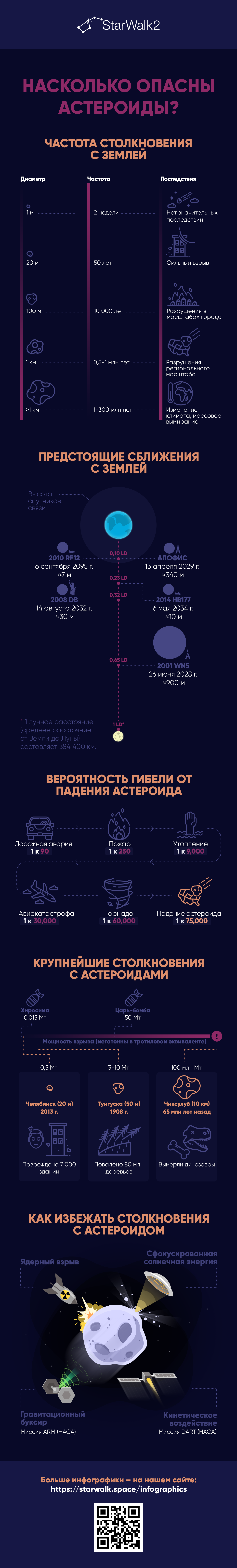 Многие задаются вопросом: что произойдет, если на нашу планету упадет астероид? На самом деле, небольшие астероиды падают на Землю каждые две недели, и ничего особенного не происходит. Но что, если с Землей столкнется гигантский астероид? Читайте нашу инфографику, чтобы узнать, какие разрушения могут приносить астероиды и как избежать столкновения с ними. Поделитесь этой инфографикой с друзьями, если она вам понравится! Вы также можете найти ее в нашем Instagram-аккаунте с помощью хэштега #infographics_StarWalk. Подписывайтесь на нас в Instagram, чтобы узнать больше полезной информации из мира астрономии!