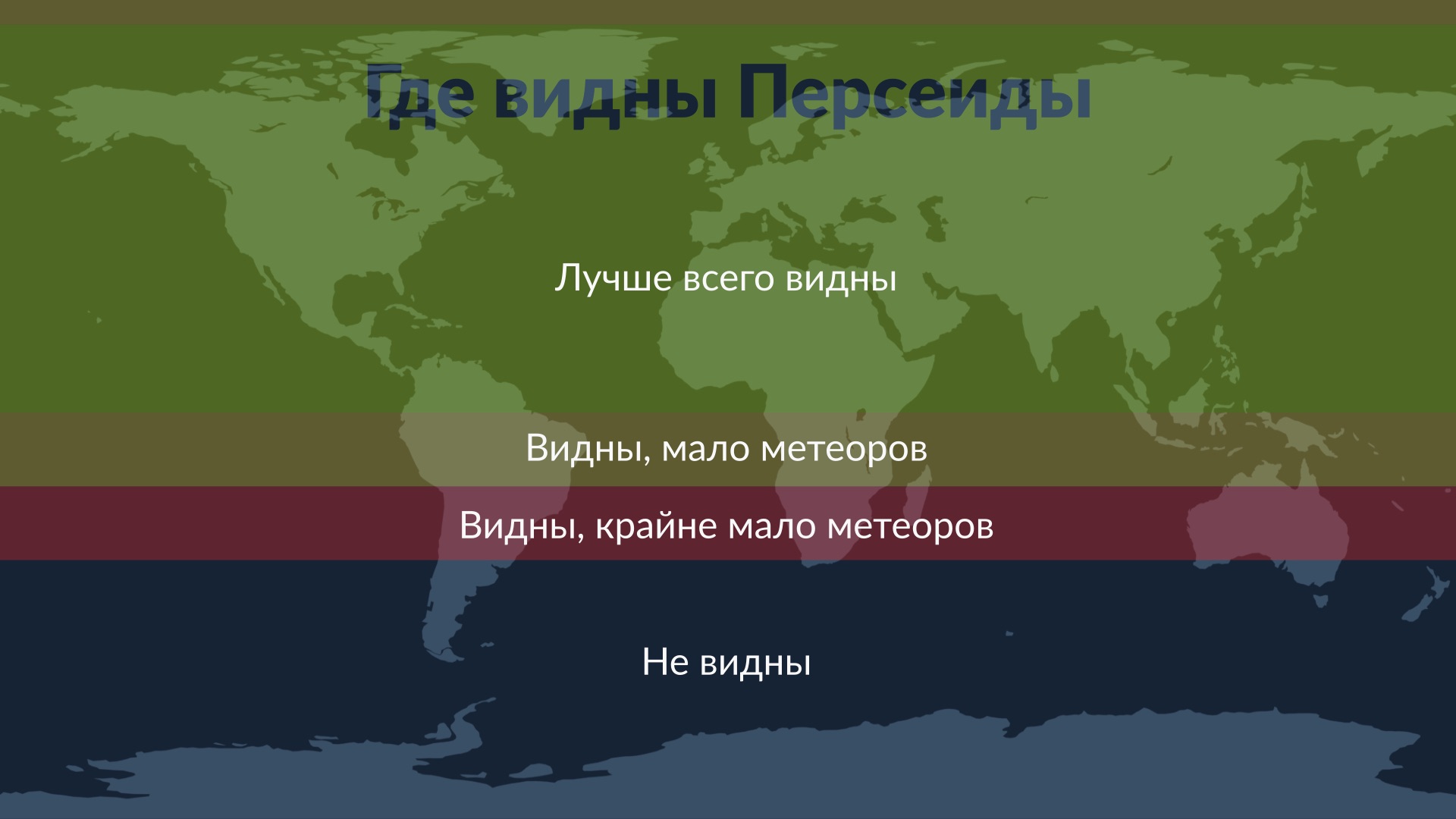 Персеиды лучше всего наблюдать в средних северных широтах. Там радиант поднимается высоко на небе около 22:30 по местному времени. К сожалению, Персеиды невозможно увидеть из большей части Южного полушария.