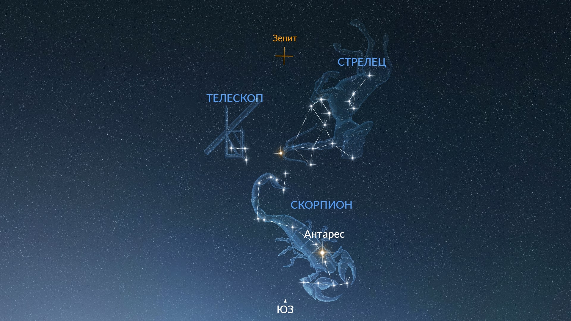 В Южном полушарии Стрелец виден высоко на небе, почти в зените. Под созвездием Стрельца легко найти яркий красный Антарес в Скорпионе.
