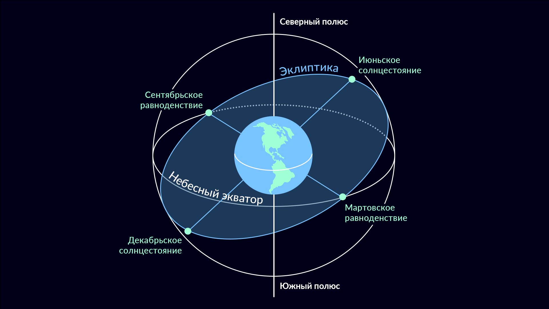 Время наступления событий. Равноденствия происходят в марте и сентябре, а солнцестояния – в июне и декабре.