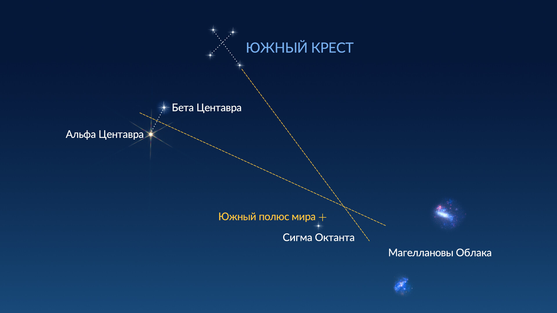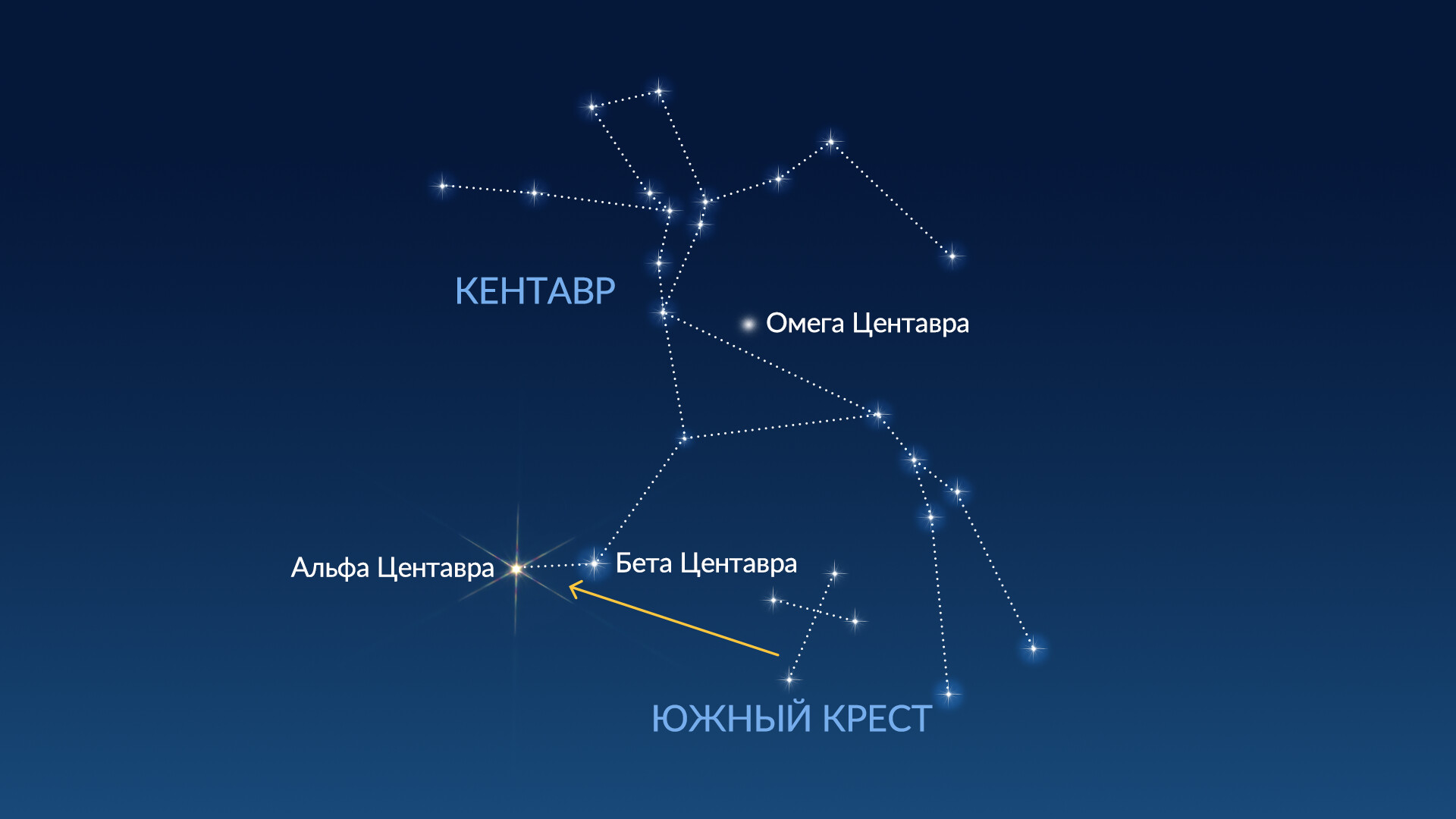 Центавр расположен рядом со знаменитым созвездием Южного Креста. Если вы когда-нибудь видели Южный Крест, вы, скорее всего, замечали и две самые яркие звезды Центавра – Альфу и Бету Центавра. Теперь давайте разберёмся, как определить весь контур созвездия.